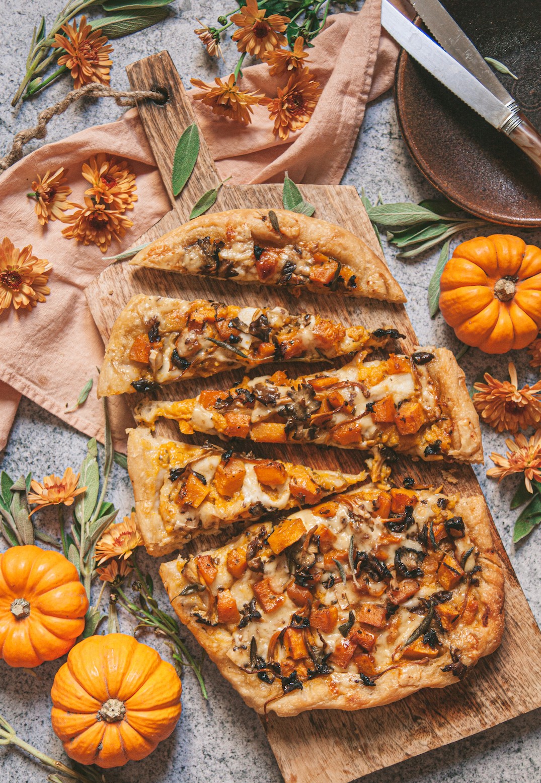 Chiếc bánh pizza ra lò thơm nức mũi, không phải là vị sốt cà chua quen thuộc mà là sốt bí đỏ cùng với các miếng bí ngọt bùi, béo thơm, nấm thì giòn sần sật, phô mai ngậy và lá xô thơm điểm thêm một hương vị tươi mát cho món bánh pizza mùa thu.