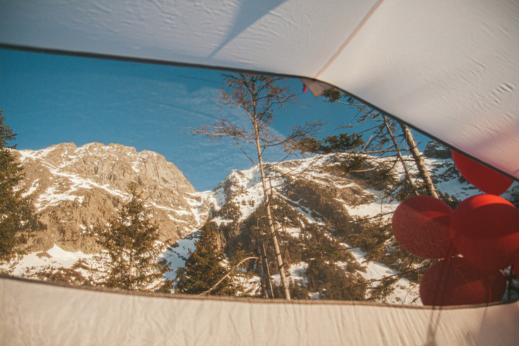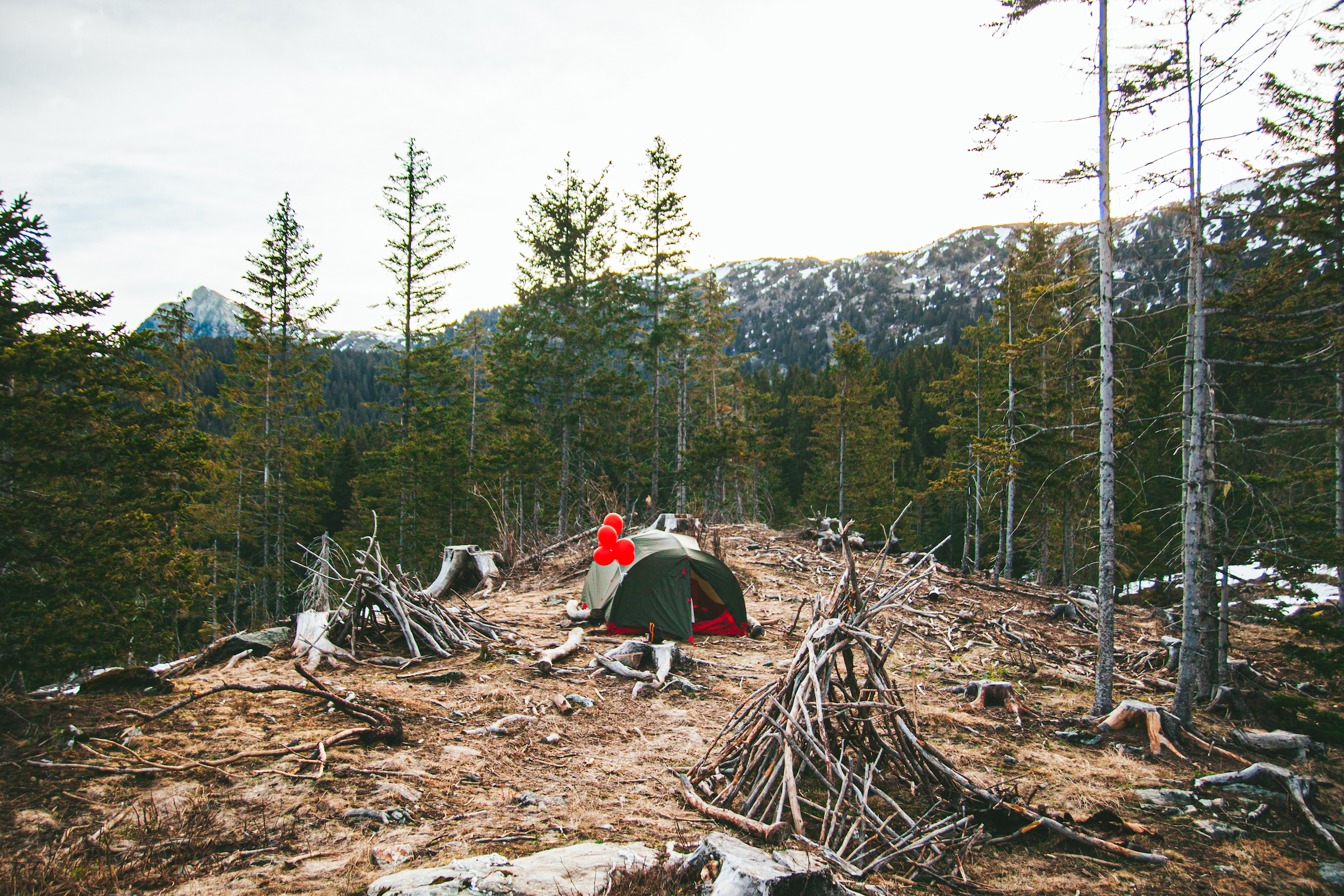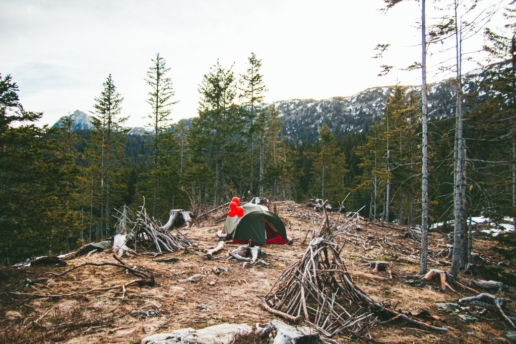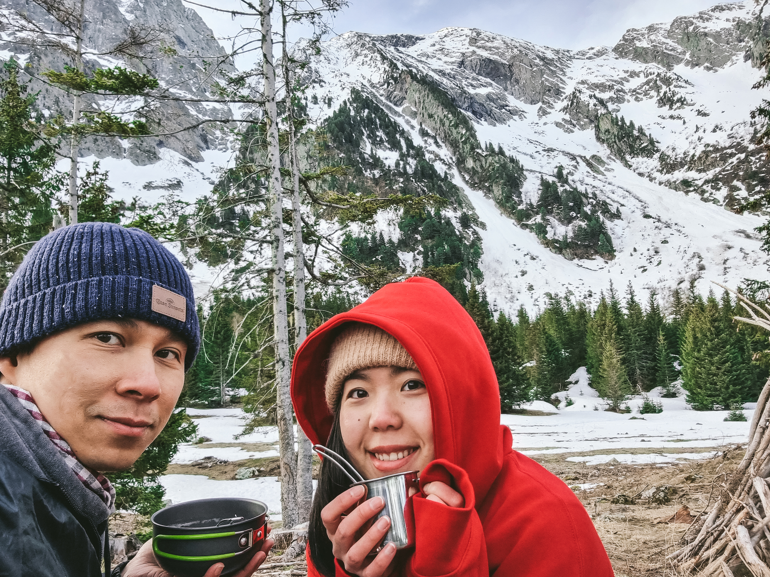 Lúc quay về lều mình thực sự mới để ý xung quanh chỗ mình dựng lều hôm qua có hai căn lều gỗ nho nhỏ, chắc cũng đã từng có bạn cắm trại vui chơi trên này rồi vì đây quả là chỗ đắc địa quá. Ngay trước lều lại còn có ngay một thân cây để làm bàn chuẩn bị đồ ăn nữa quá tiện luôn! Chỉ chờ mặt trời lên sau dãy núi kia thôi là ánh nắng sẽ phủ vàng khắp nơi luôn. Dù sương giá mùa này ít hơn hồi mùa thu nhưng mặt lều khi chưa có nắng thì vẫn có những băng tuyết phủ trắng một lớp mỏng, bọn mình cần phải phơi khô rồi mới xếp lại cho vào ba lô được.