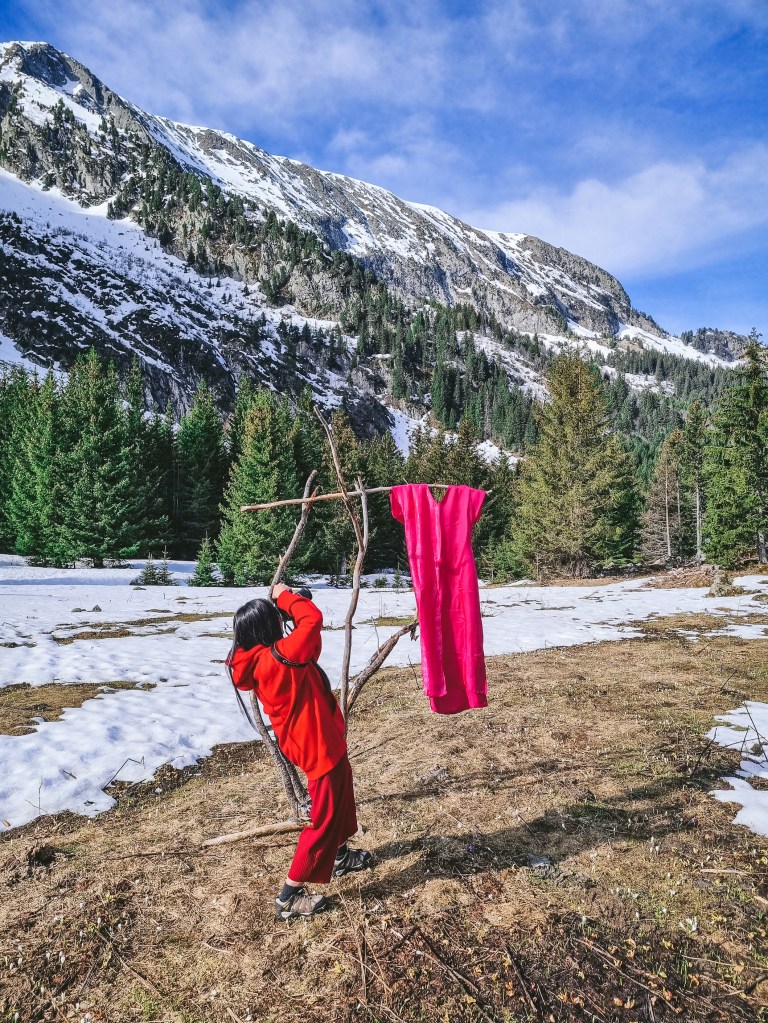 Sau khi uống một ngụm trà vải hoa hồng thơm nức, anh M thì vẫn luôn có bộ pha cà phê mang theo mọi lúc mọi nơi nên lách cách ngồi pha, mình chạy loanh quanh tìm đạo cụ và ngắm trước một số góc để chụp hình cho dự án mới của mình. Chả là mình sắp cho ra mắt ở Paris một dòng quần áo may bằng lụa dệt và nhuộm thủ công của Việt Nam, được thêu tay tỉ mỉ từ những làng nghề ở Việt Nam luôn, nên đợt này mình tranh thủ mang theo hai mẫu sản phẩm lên núi chụp thử để làm bộ ảnh campaign mùa Xuân Hè 2022 luôn. Khi nào ra mắt mình sẽ khoe mọi người kỹ hơn nhé! ^^ Trong hình là cái cây bọn mình vác từ trên đồi xuống, anh M chèn đá và cành cây mãi mới đứng được, và cái váy lụa óng ánh trong nắng bay thướt tha trong gió đẹp đến mức làm tim mình lỡ cả nhịp luôn ý!