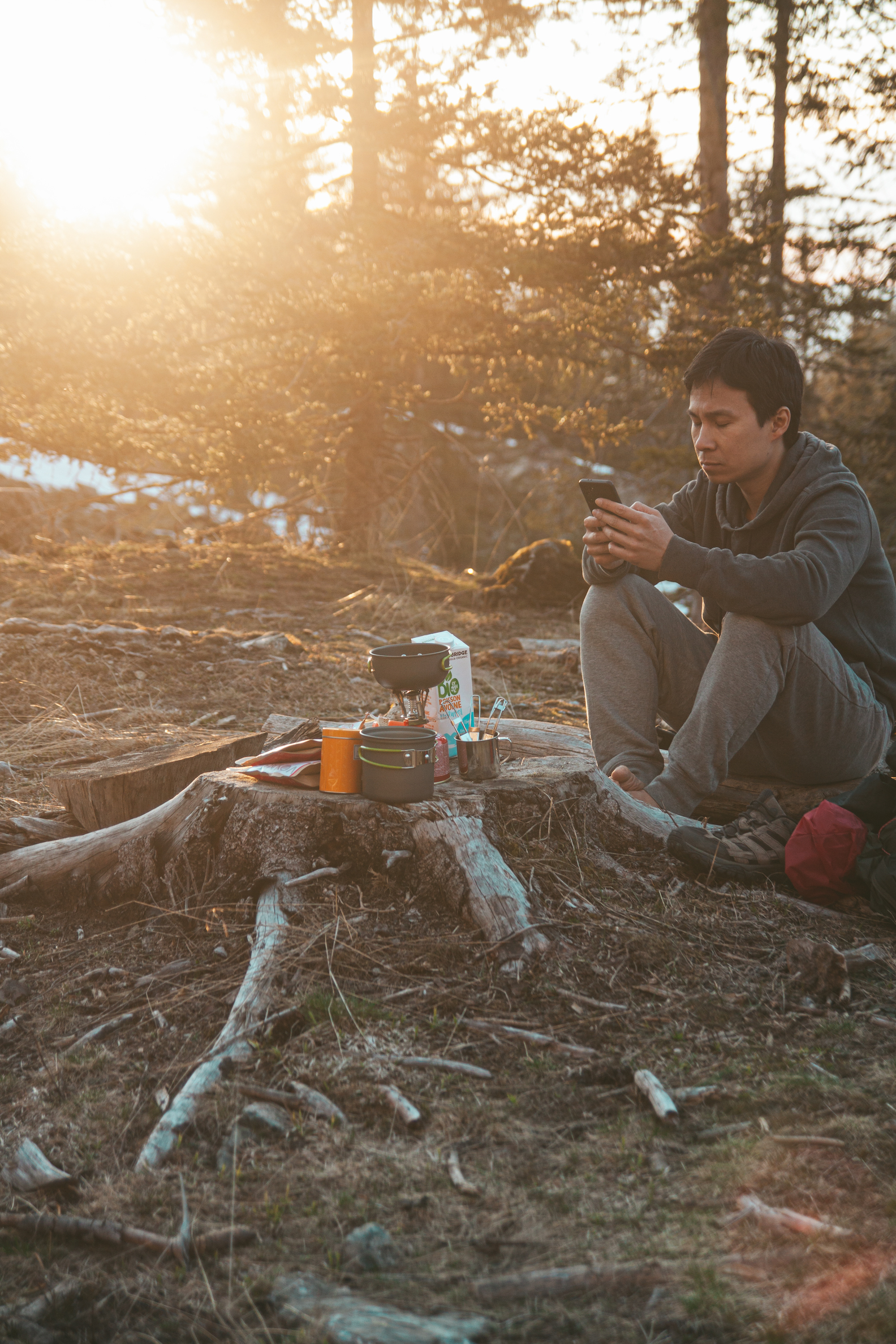 Đồ nghề đã bày ra hết rồi, chỉ còn đun nước để đổ vào gói đồ ăn nữa thôi. Trời vẫn chưa tối nên mình lại lang thang thơ thẩn chụp ảnh, nhặt lá, nhặt cành cây đẹp và chắc để làm gậy chống. Quay ra thấy đồng chí M thì đang xem điện thoại thì mình gào thét mỉa mai sao không ngắm cảnh đẹp đi lại ngồi nghịch điện thoại, mà cũng có sóng đâu, ai ngờ sau mới biết là đang tìm lại nhạc đã tải về máy từ lúc trước để bật ra chúc mừng sinh nhật mình vào buổi tối =)). Thế nên mặt mày mới nhăn nhó đầy cam chịu cái đứa lắm mồm đang léo nhéo bên cạnh thế kia các bác ạ!!