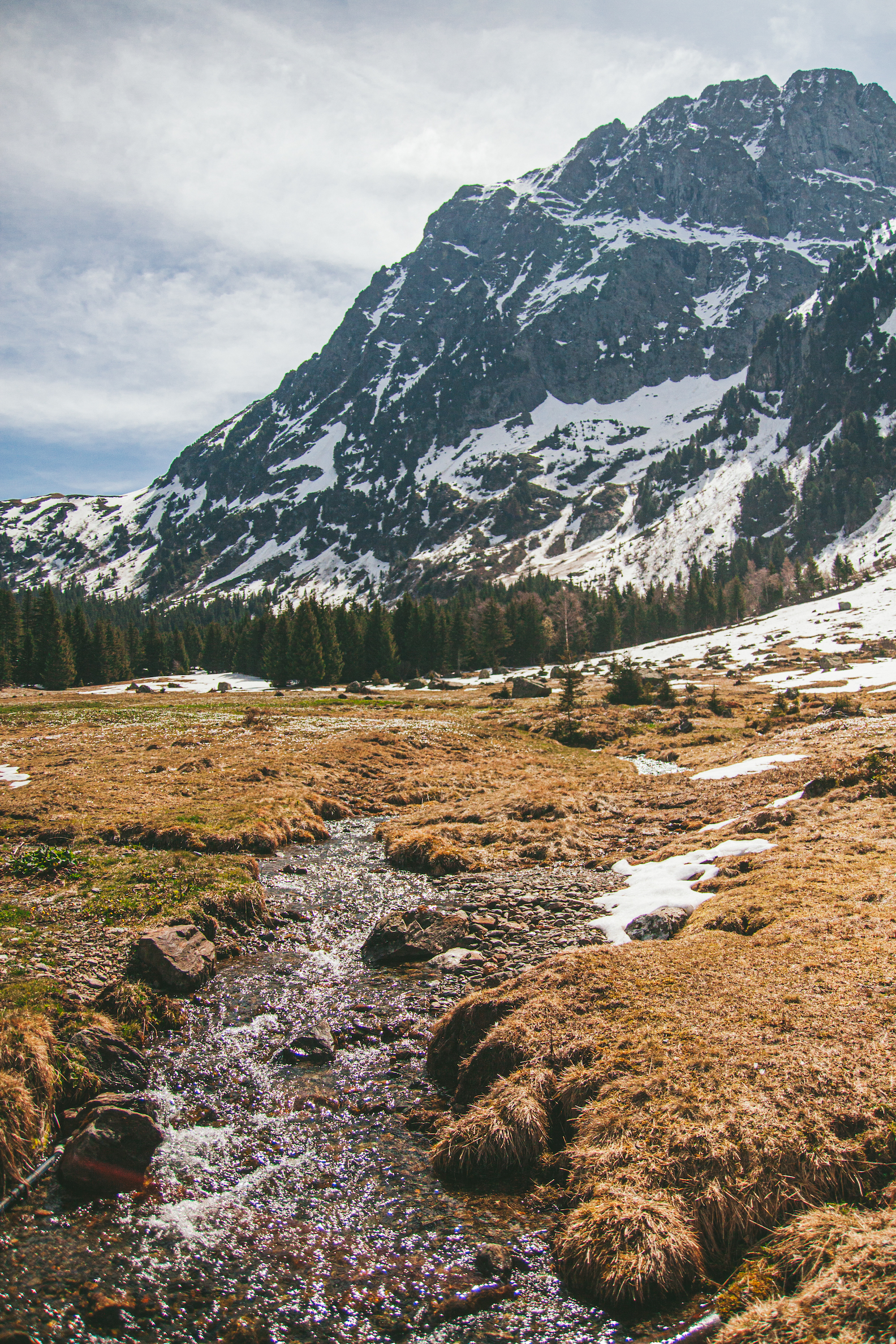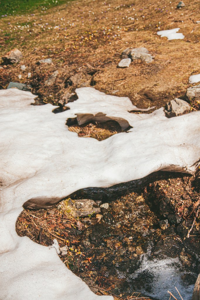 Cũng không có nhiều thời gian vì vẫn còn đoạn đường dài phải leo nữa, nên sau khi nghỉ ngơi nạp năng lượng một chút, bọn mình rất lưu luyến mà rời khỏi bờ hồ. Đi qua cụm những căn nhà nhỏ đóng cửa im lìm, trải ra trước mắt là một trảng cỏ rộng với dãy núi tuyết trắng phía sau. Giữa màu cỏ úa vàng là những mạch nước đầu xuân, vừa tan ra từ băng tuyết chảy róc rách uốn lượn, lấp lánh dưới ánh nắng mặt trời chói chang.