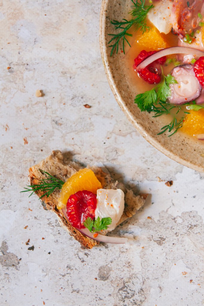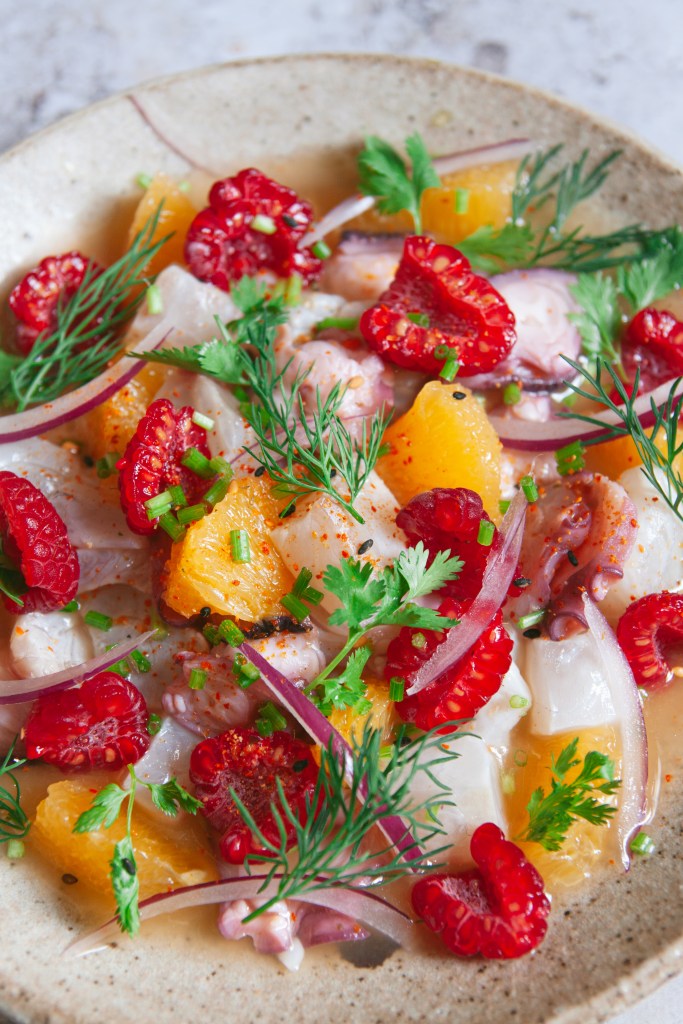 Ceviche là một món ăn khá là phóng khoáng và tuỳ hứng, ngoài nguyên liệu chính và cách xử lý cá tươi như trên, thì mình có thể kết hợp với bất cứ nguyên liệu và loại thảo mộc nào mà mình thích và có sẵn. Hôm nay nhà mình làm cùng với cam và quả mâm xôi, thêm một chút hành tây tím, thì là và rau mùi. Mình cũng thêm cả bạch tuộc để món ăn có thêm độ giòn dai. Món này mình có ăn ở một nhà hàng và sau đấy thì về nhà mình chế thêm với cam và bột ớt shichimi togarashi (bột ớt trộn cùng với một ít vừng rang thơm) để món ăn có thêm tầng hương vị hấp dẫn hơn. Các bạn Peru sẽ thường cho thêm rất nhiều thứ như quả bơ, cà chua, dưa chuột….thái nhỏ, nên bạn hãy tuỳ vào những nguyên liệu mà tủ lạnh nhà bạn đang có và theo khẩu vị của mình để kết hợp ra món cá ceviche của riêng bạn nhé! ^^