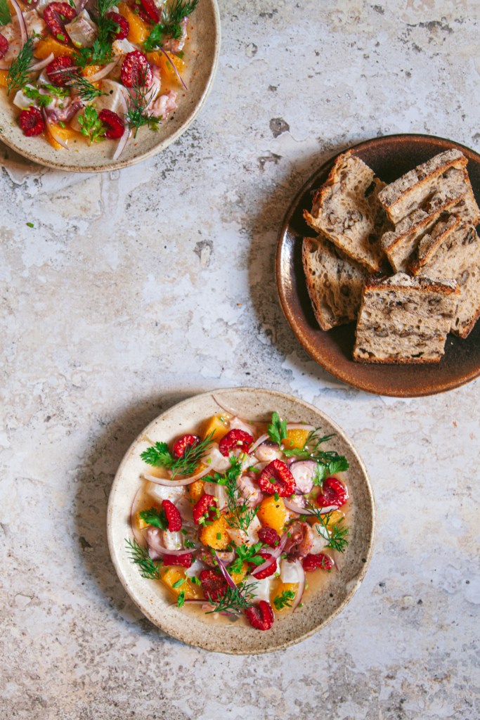 Với món ăn mà các thành phần đơn giản và không được nấu chín như món ceviche này, bạn hãy dùng những nguyên liệu tươi ngon và đảm bảo nhất để có được một món ăn bùng nổ hương vị nhé! Mình dùng cá ikejime và các loại hoa quả vào mùa rất thơm và mọng nước. Khi ngâm cá với nước cốt chua từ chanh và cam, lúc này thịt cá sẽ tiết nước ra nên phần sốt ướp này sẽ rất ngon và đậm đà. Món này ăn với một vài lát bánh mỳ thật ngon là chuẩn nhất, để sau khi ăn hết phần cá, mình còn có thể dùng bánh mỳ thấm hết phần sốt chua chua hấp dẫn nữa! ^^