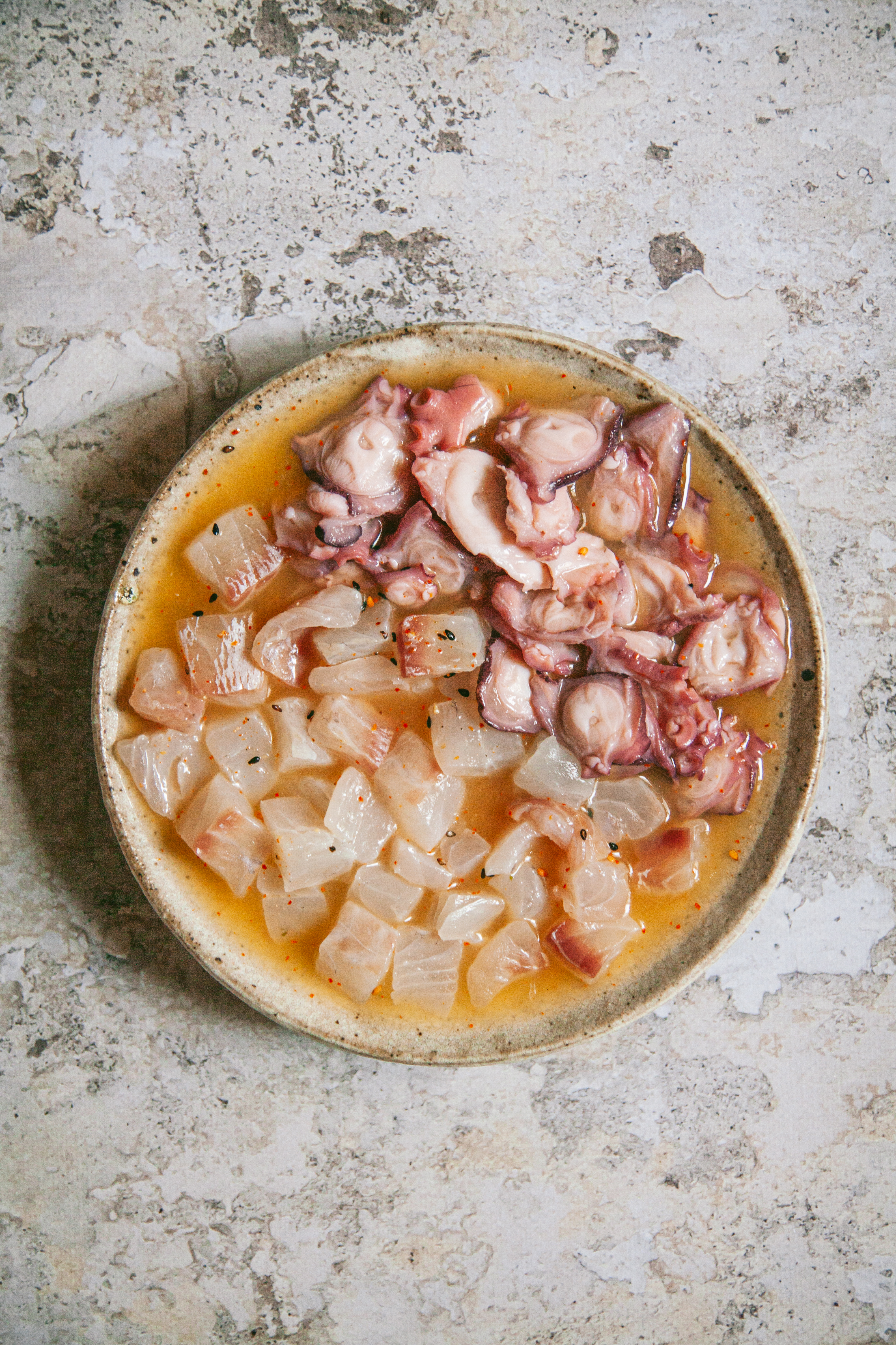 - Xếp cá và bạch tuộc vào đĩa sâu lòng. Trộn đều nước cốt cam, nước cốt chanh, muối và bột ớt rồi đổ vào cá + bạch tuộc. Trộn sơ cho cá và bạch tuộc ngấm đều rồi để ngâm ướp trong vòng 30 phút trong ngăn mát tủ lạnh.