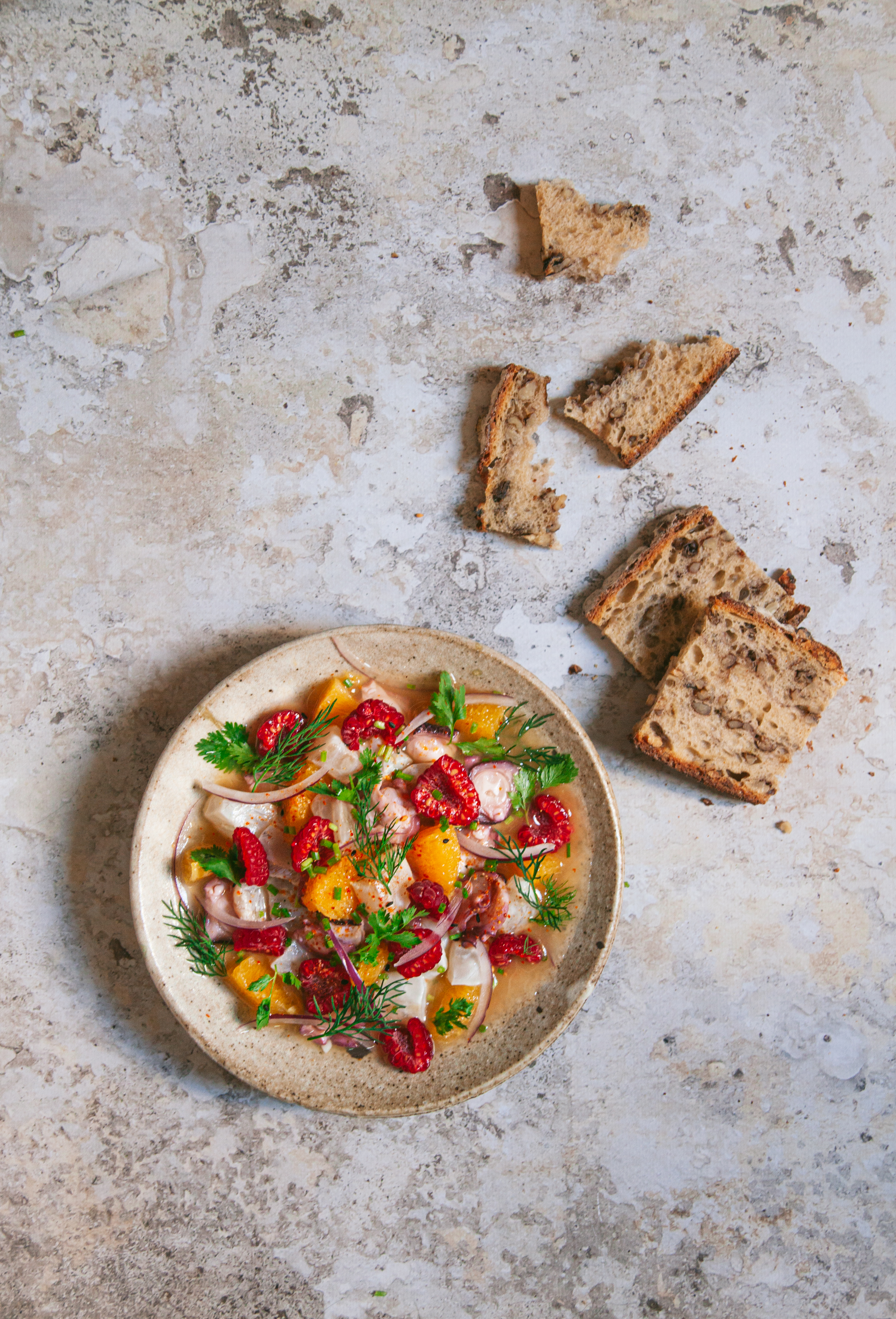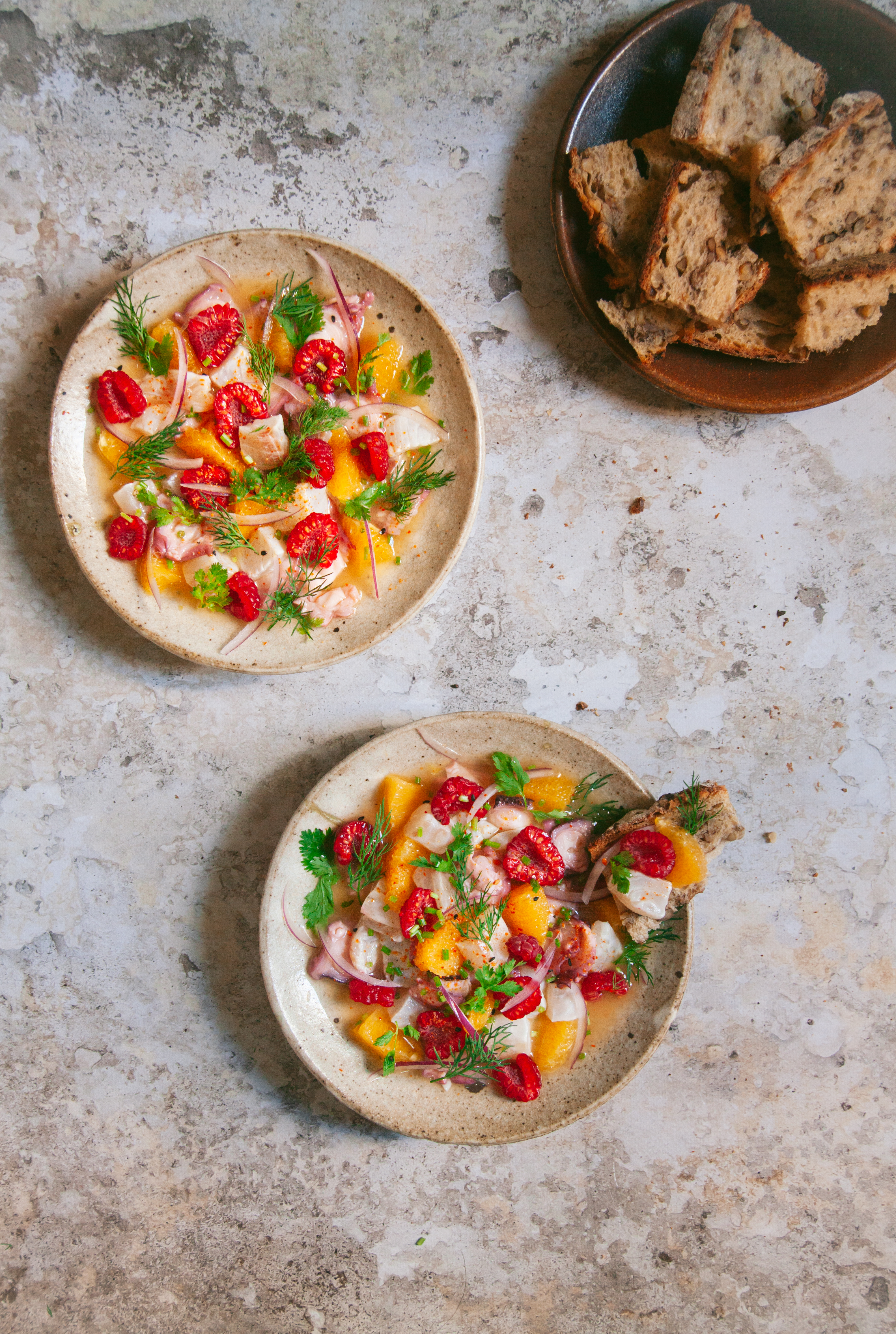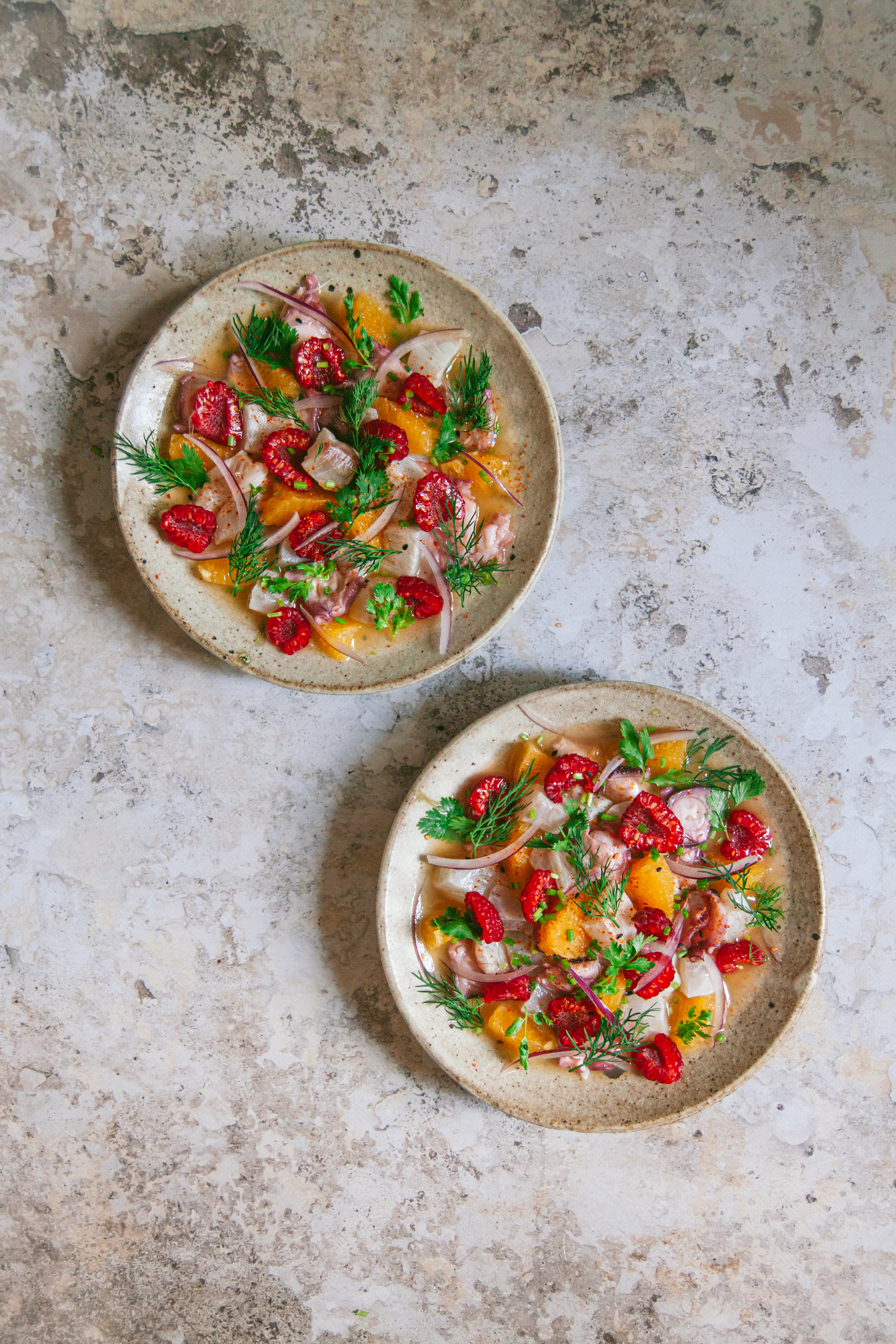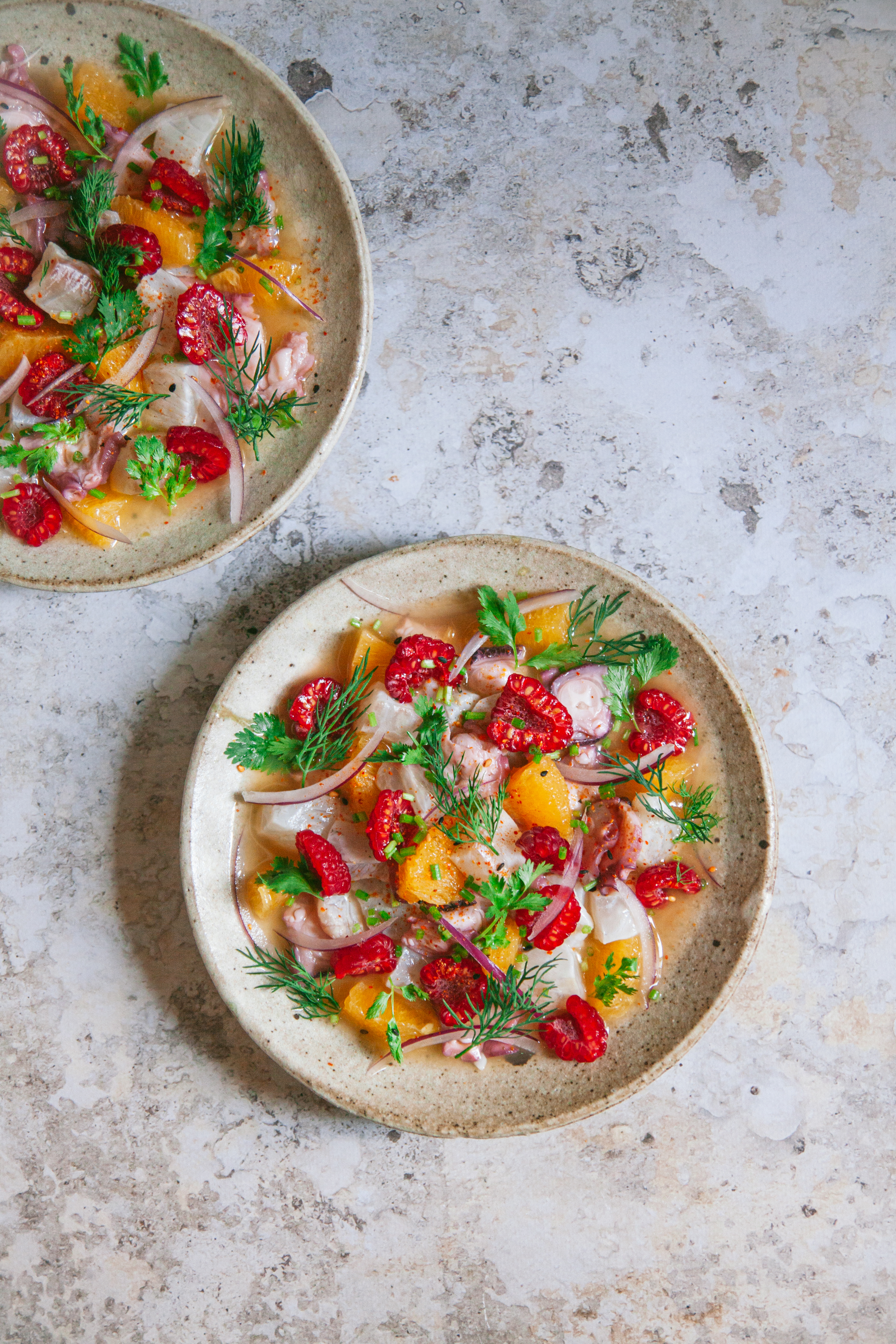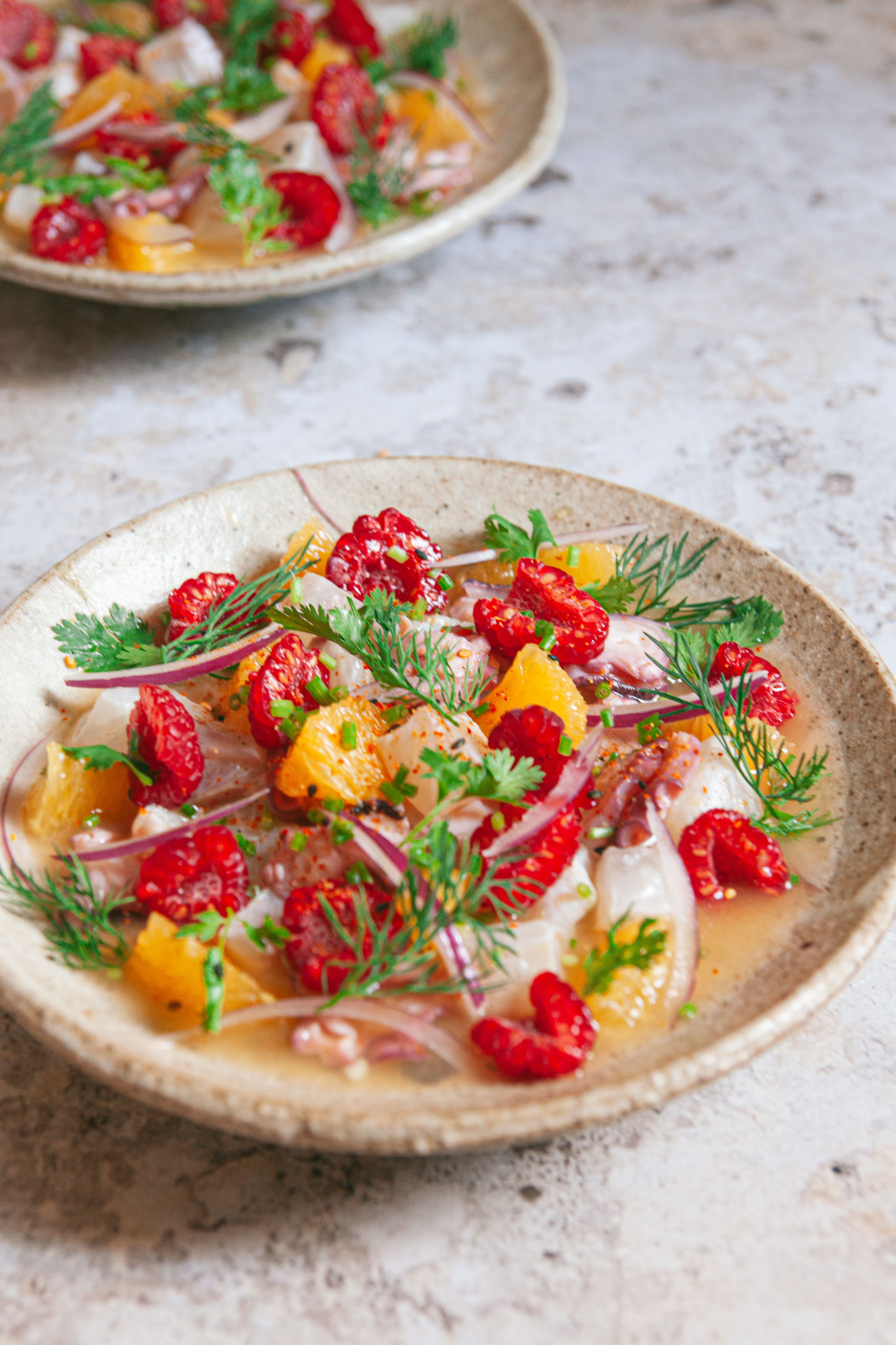 Ceviche là một món ăn khá là phóng khoáng và tuỳ hứng, ngoài nguyên liệu chính và cách xử lý cá tươi như trên, thì mình có thể kết hợp với bất cứ nguyên liệu và loại thảo mộc nào mà mình thích và có sẵn. Hôm nay nhà mình làm cùng với cam và quả mâm xôi, thêm một chút hành tây tím, thì là và rau mùi. Mình cũng thêm cả bạch tuộc để món ăn có thêm độ giòn dai. Món này mình có ăn ở một nhà hàng và sau đấy thì về nhà mình chế thêm với cam và bột ớt shichimi togarashi (bột ớt trộn cùng với một ít vừng rang thơm) để món ăn có thêm tầng hương vị hấp dẫn hơn. Các bạn Peru sẽ thường cho thêm rất nhiều thứ như quả bơ, cà chua, dưa chuột….thái nhỏ, nên bạn hãy tuỳ vào những nguyên liệu mà tủ lạnh nhà bạn đang có và theo khẩu vị của mình để kết hợp ra món cá ceviche của riêng bạn nhé! ^^