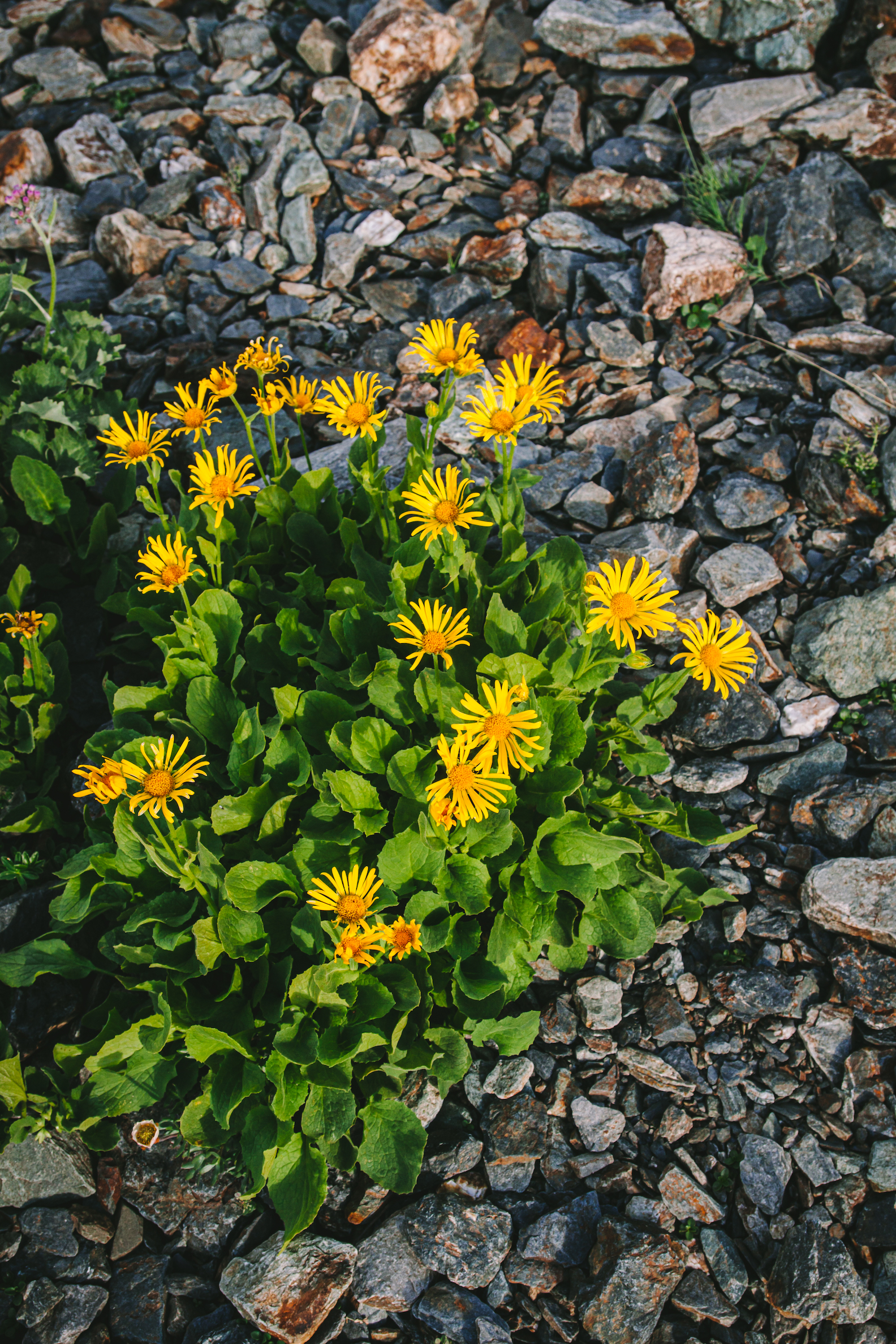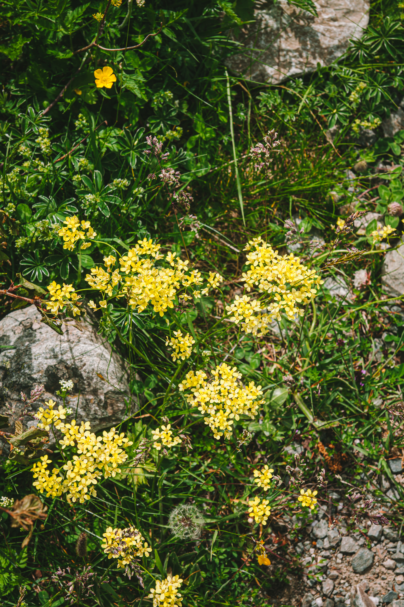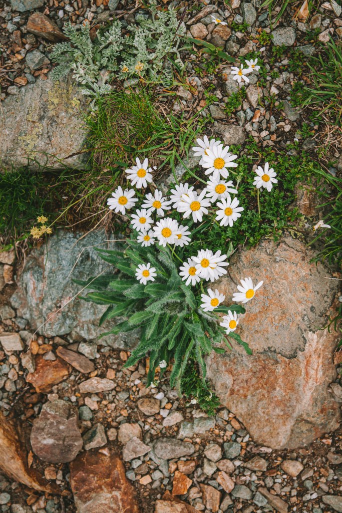 Ở đây mình còn tìm thấy cả tỏi gấu! Nếu không nhờ vào những bông hoa trắng bé xinh nở muộn thì chắc mình cũng không nhận ra đây là tỏi gấu, vì có lẽ ở trên cao nên lá của cây dày và dai hơn hẳn so với tỏi gấu mình hái dưới thấp hơn đợt trước, chỉ có mùi tỏi hăng nồng nặc là vẫn như thế – 1 đặc điểm nhận dạng rõ ràng nhất của loài cây này. Mình còn thấy cả những bông cúc trắng muốt nhị vàng, và những đám hoa màu hồng bé li ti bám lên những phiến đá.