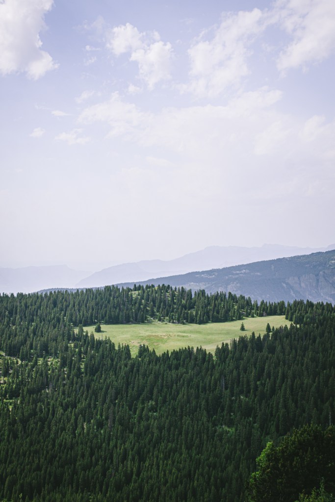 Lúc này bọn mình đã lên khá cao, phía sau lưng là toàn cảnh dãy núi Vercors phía xa, ở góc trái là cụm nhà hameau Poursollet và hồ Poursollet xanh thẫm.