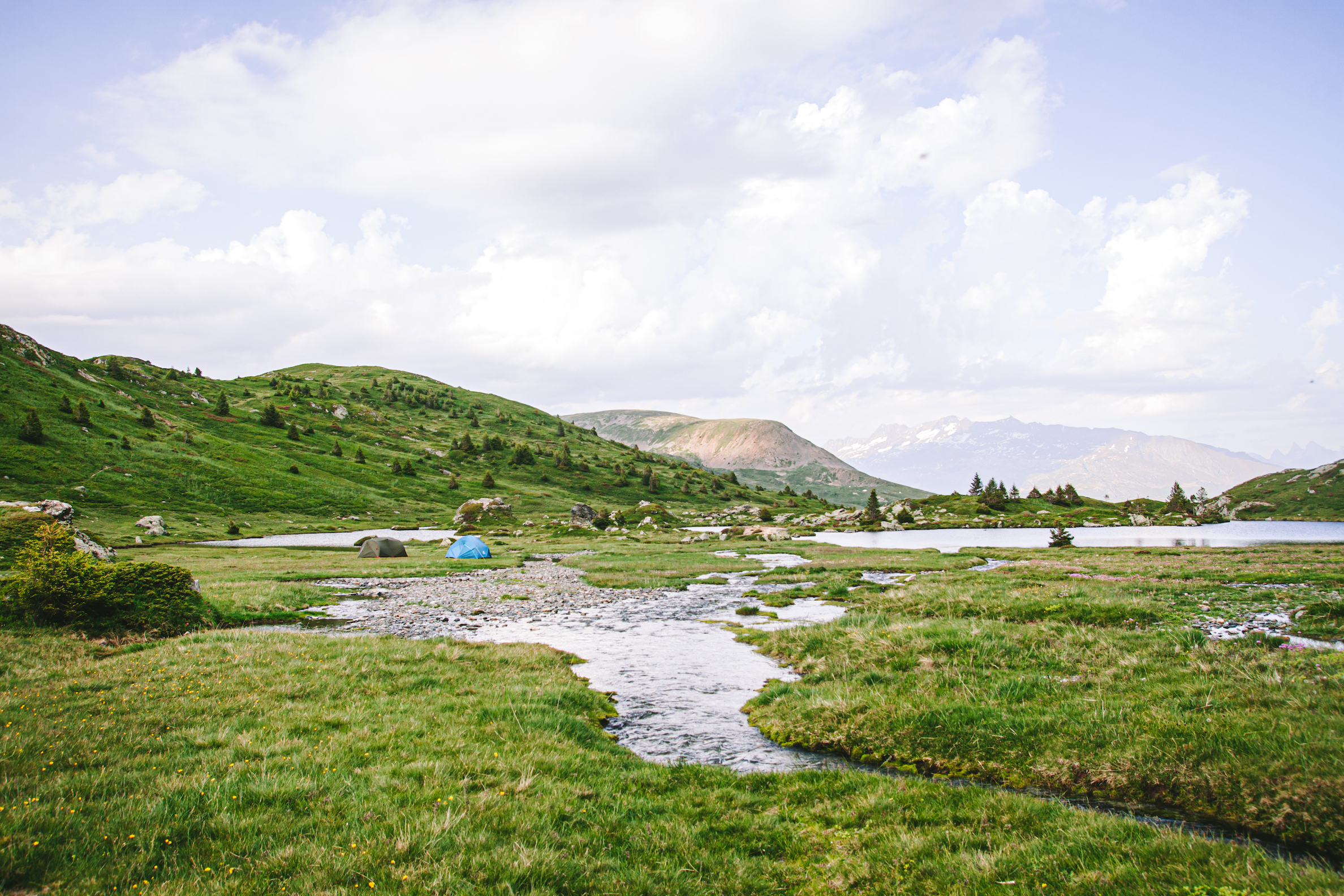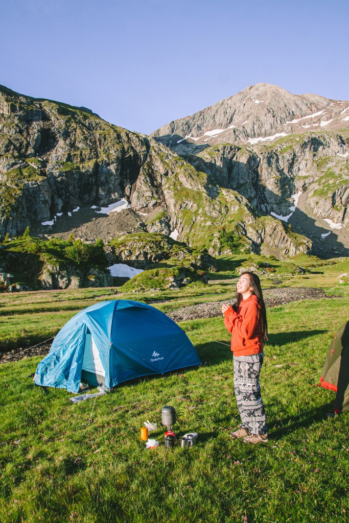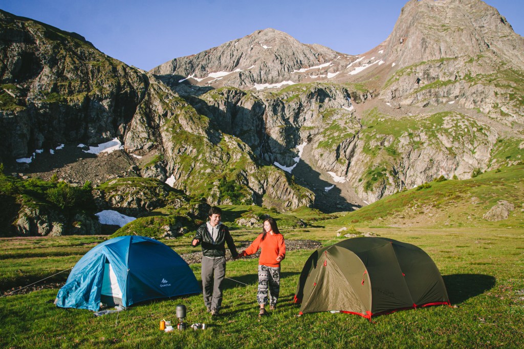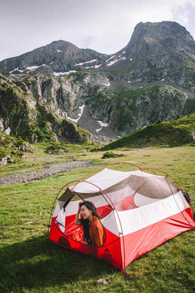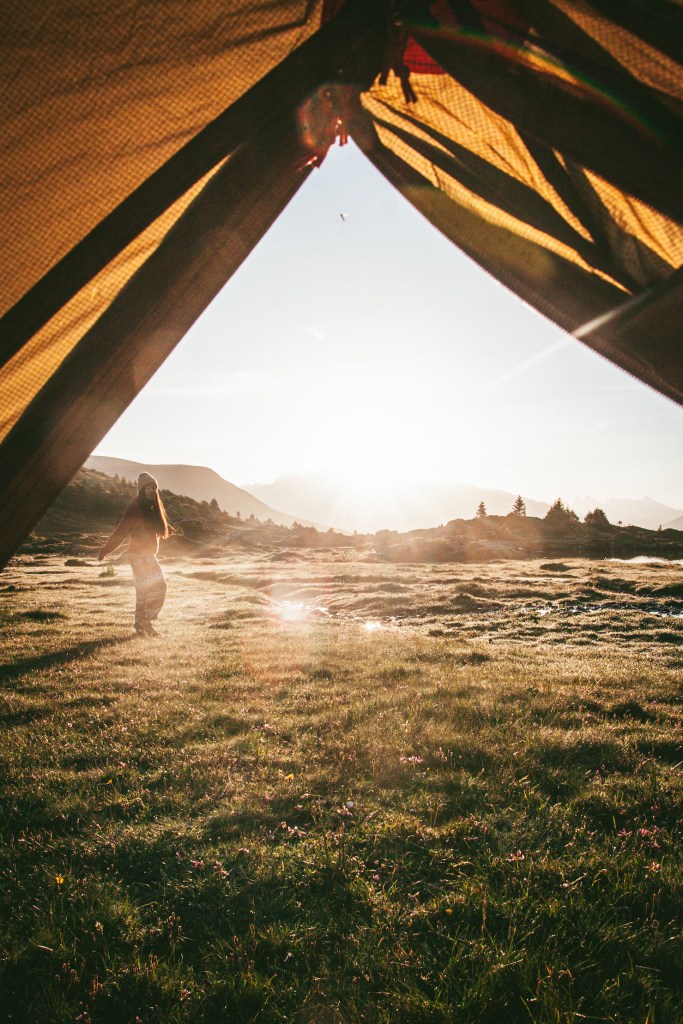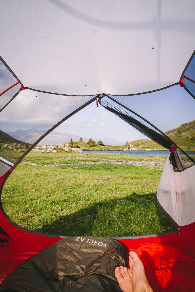 Kinh nghiệm dựng trại của mình là sau khi dựng lều theo hướng dẫn sử dụng của mỗi loại lều, đầu tiên mình sẽ trải xuống 1 lớp chăn cứu sinh (loại chăn màu bạc hay được dùng trong công tác cứu hộ), để giúp cách nhiệt với nền đất bên dưới. Chăn có giá thành rẻ (dưới 5e), cũng mỏng nhẹ rất tiện mang theo, hơn nữa còn là loại dai và khá bền để sử dụng nhiều lần. Sau đó sẽ thổi phồng đệm ngủ, trải túi ngủ lên trên, thổi phồng gối nếu có hoặc cuộn quần áo làm gối. Ba lô và giày mình sẽ để bên ngoài lều, phần có bạt lều che để tránh sương. Còn bên trong lều sẽ cần chuẩn bị đèn, quần áo thay lúc ngủ, những đồ chưa ăn đến (vì để bên ngoài có thể bị các em chuột núi marmotte ăn hộ), các thiết bị điện tử như điện thoại và máy ảnh…