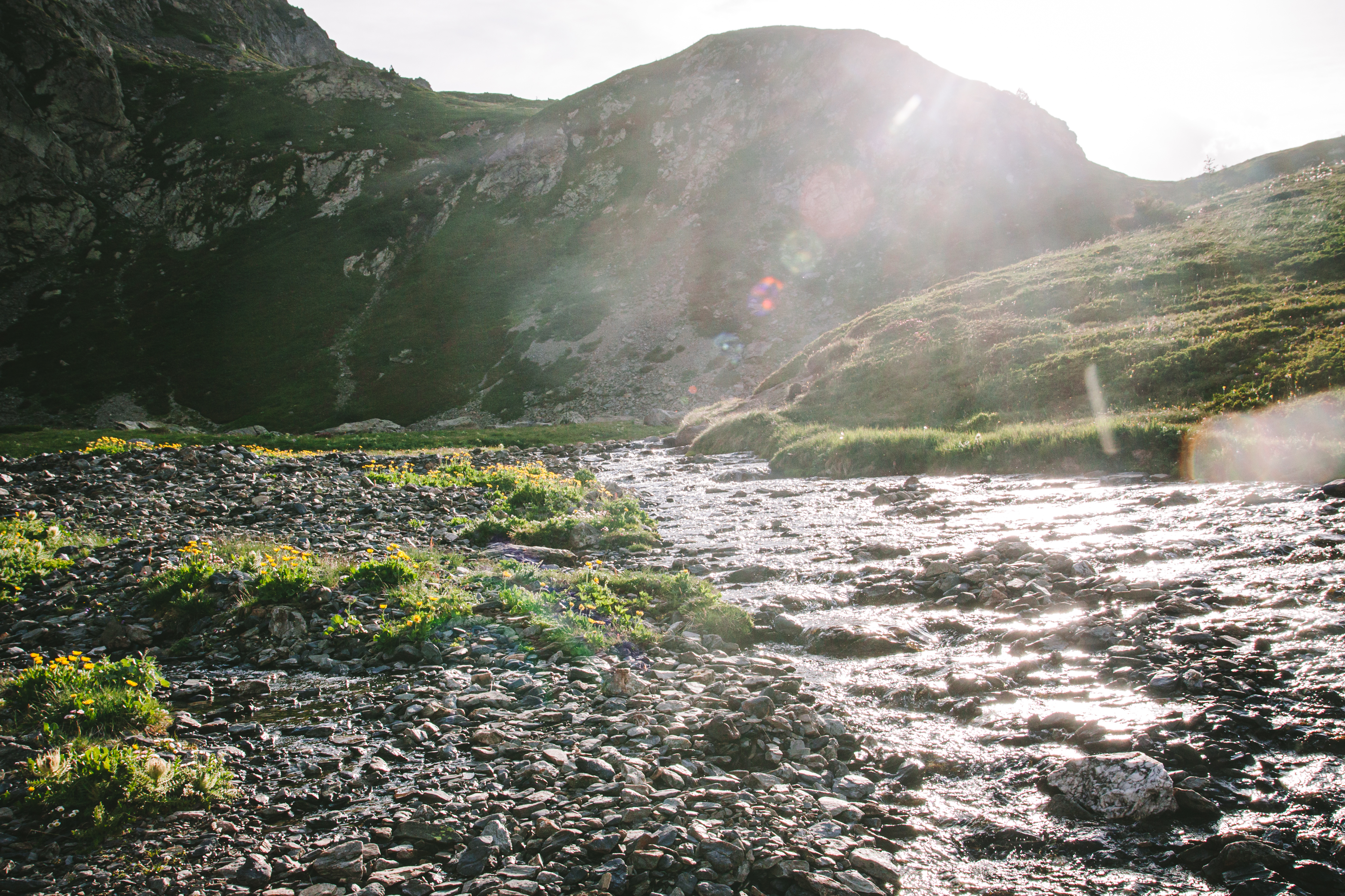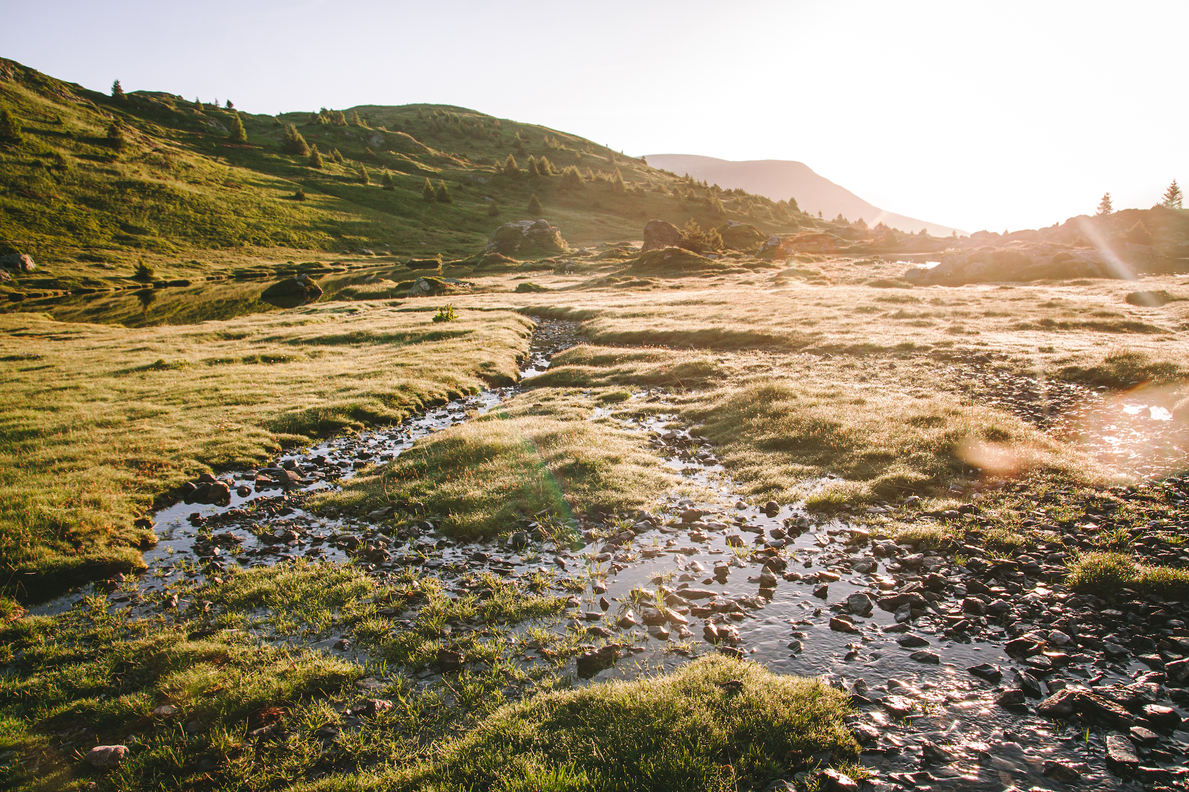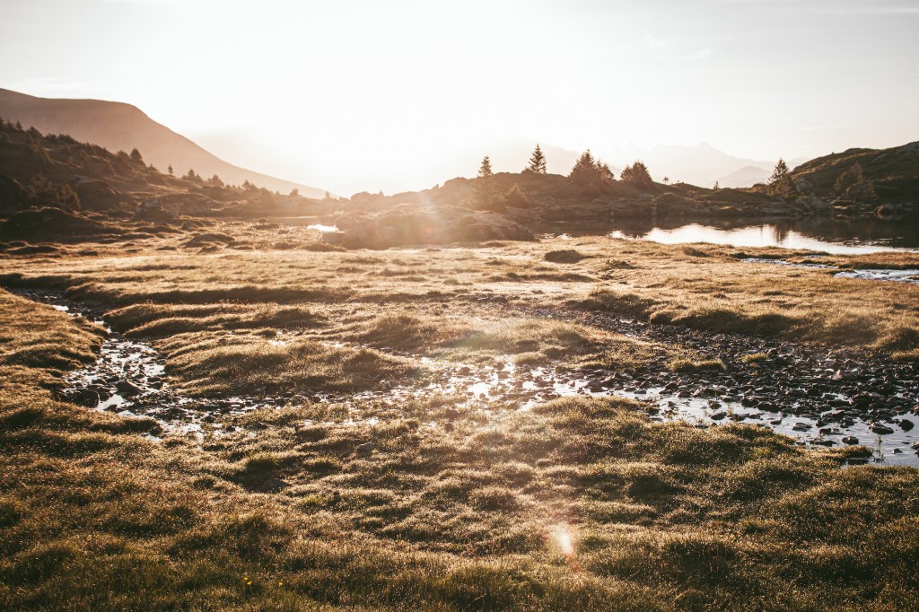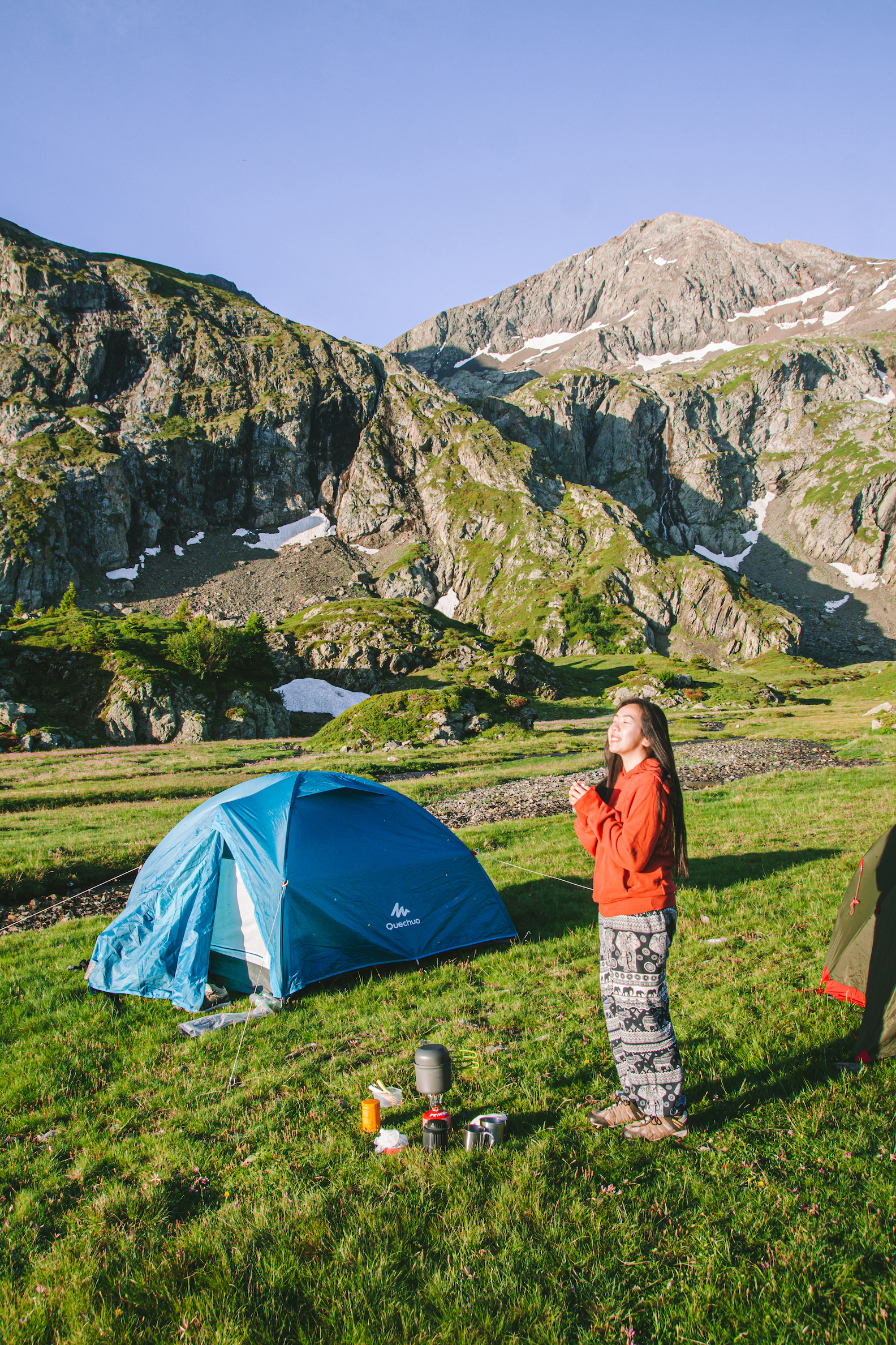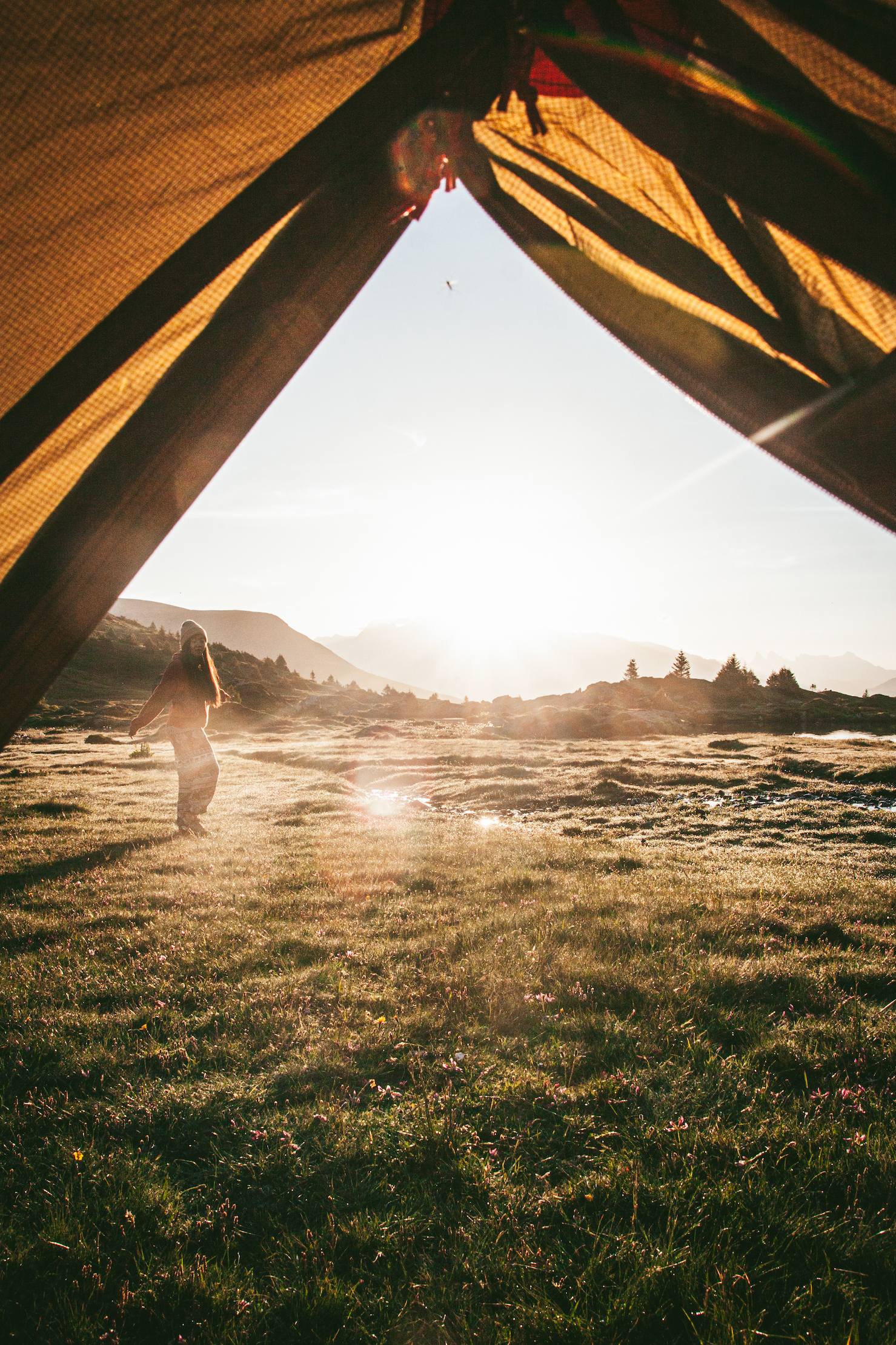 Có lẽ vì mình ngủ ngon nhất thẳng cánh cò bay đến sáng, nên mình tỉnh dậy sớm nhất. Vừa hé tấm màn cửa lều ra, là mình thấy ngay mặt trời vừa ló dạng, ánh nắng chảy tràn vào bên trong lều, óng ánh như rót mật trên khắp miền cao nguyên. Không gian tĩnh yên chỉ có tiếng rì rào chạy của dòng suối bên cạnh, cảm giác như có thể cảm nhận được cả hạt sương buổi sớm mai trên những lá cỏ. Mặt trời dần lên cao, ánh sáng và sắc màu cũng thay đổi theo từng phút.