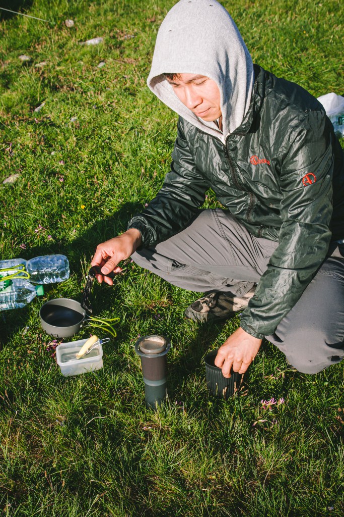 Mọi người đã dậy hết nên bọn mình bắt đầu đun nước ăn sáng với ngũ cốc và bột sữa pha với nước, bữa sáng dễ ăn và cung cấp nhiều năng lượng. Sau đó sẽ là màn trà nóng và cà phê. Với người mê cà phê như anh bồ mình thì việc uống 1 ly cà phê ngon tự tay pha trên núi, trong khung cảnh đẹp như thế là 1 trải nghiệm không thể bỏ qua mỗi lần đi cắm trại. Lúc ngay trước khi đi thì bọn mình xay cà phê trước để bớt được việc mang máy xay nặng đi theo, sau đó thì bọn mình sẽ pha bằng aeropress là tiện nhất. Aeropress bằng nhựa nên rất nhẹ, bộ của bọn mình là phiên bản GO nên mọi thứ được gói gọn gàng lại rất tiện lợi để mang theo. Sáng ra mình chỉ việc đun nước và anh bồ pha ngay cho cốc cà phê thơm nức nóng hổi.