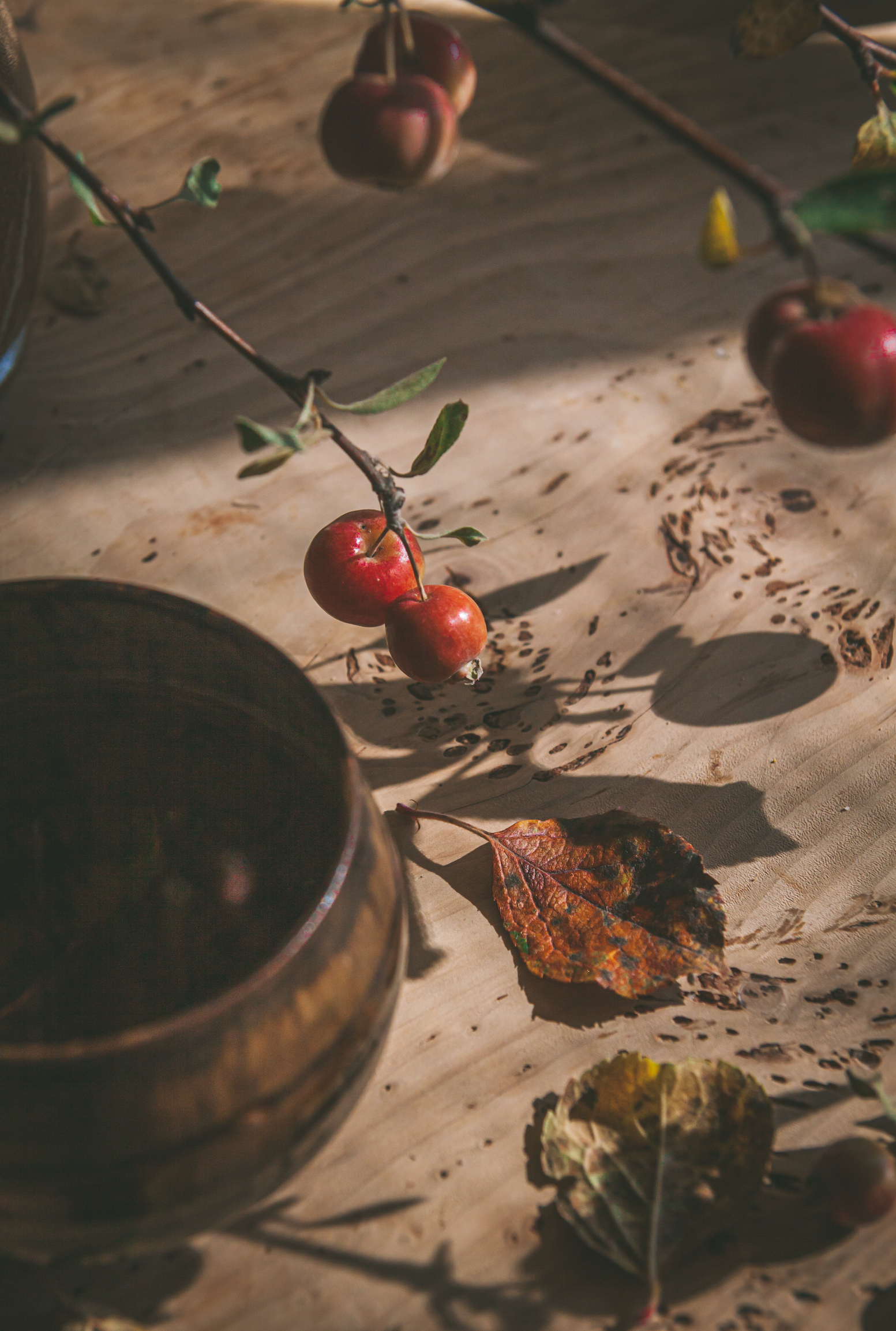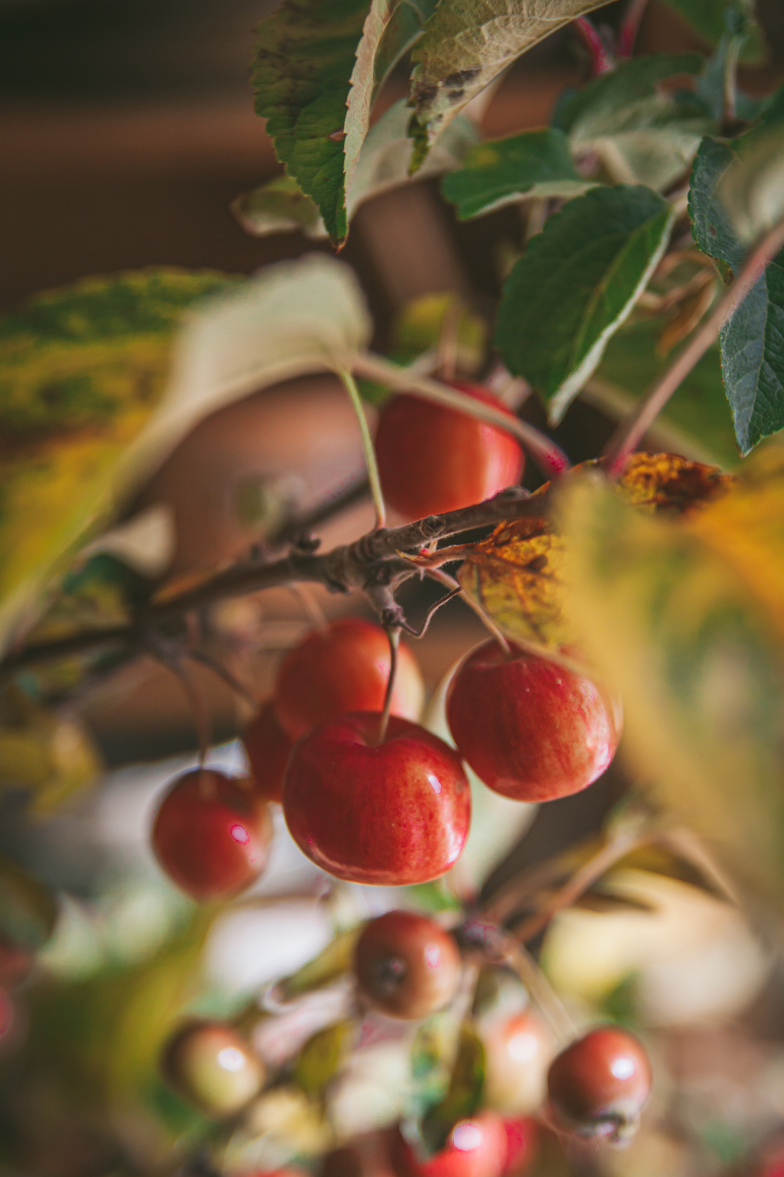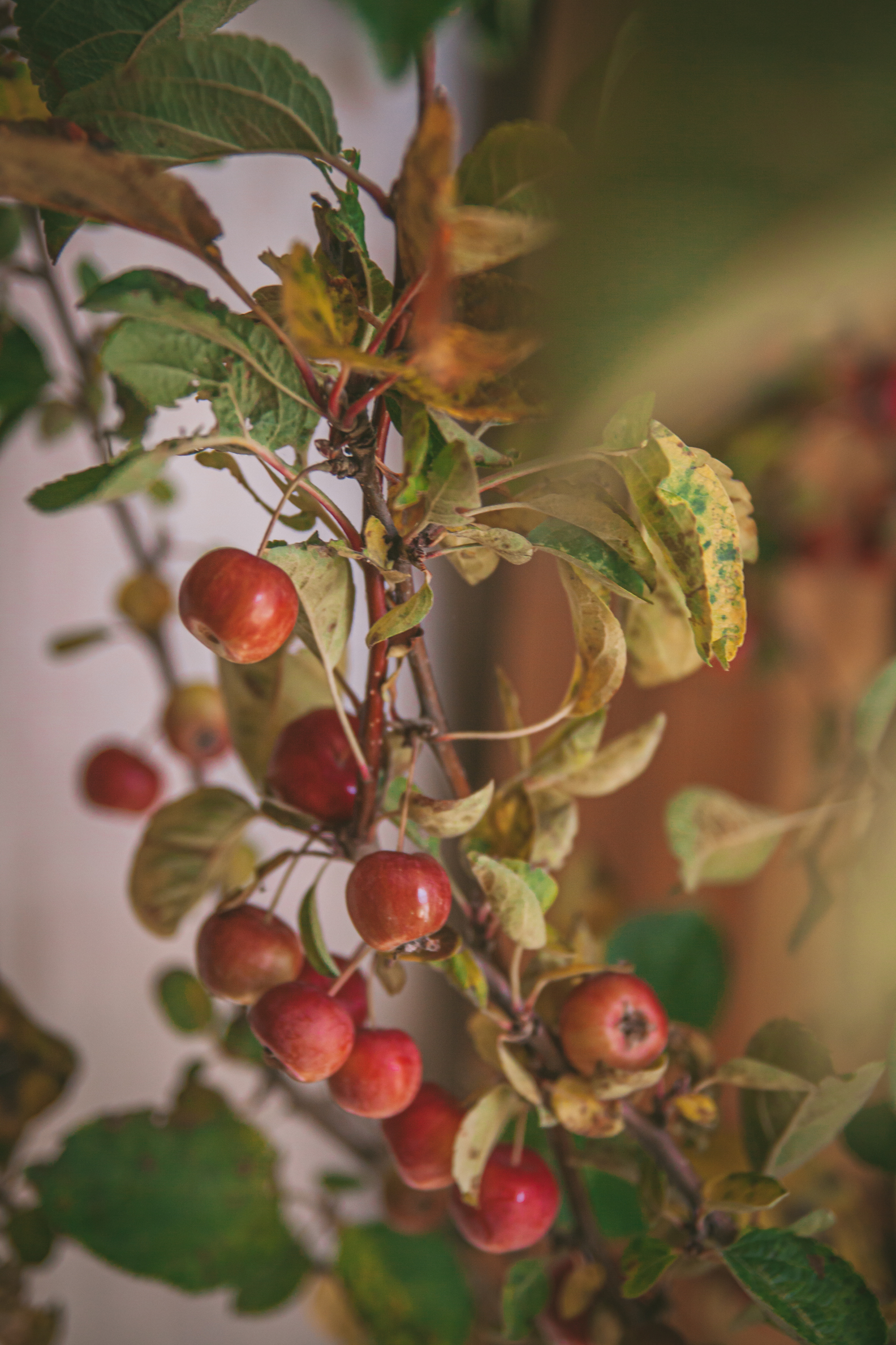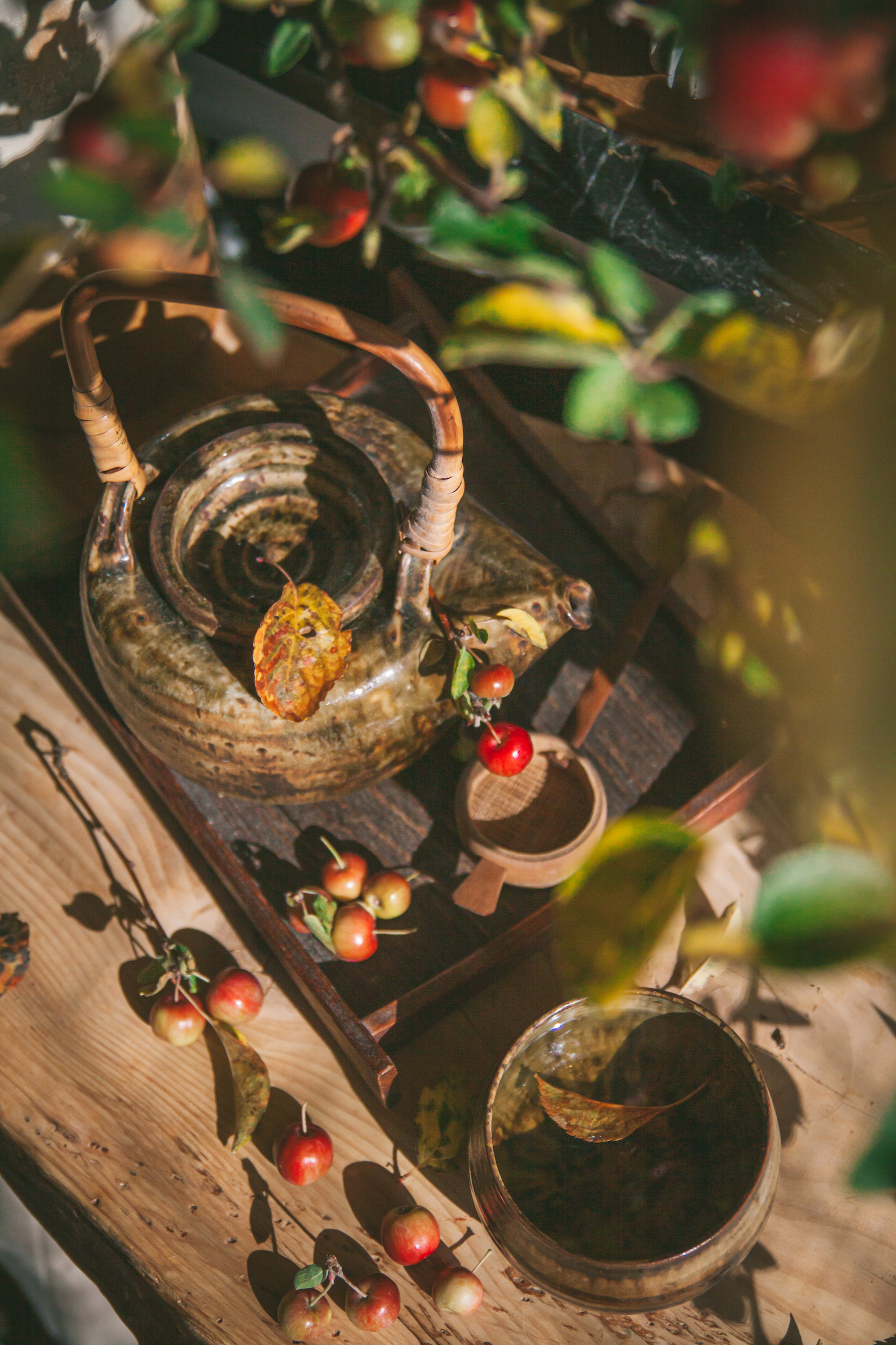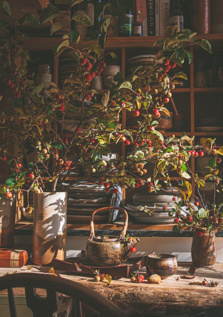 Ngước lên là chùm táo chúm chím, nhìn xuống cũng là một cành táo nhỏ sà xuống bên ly trà ấm sực.