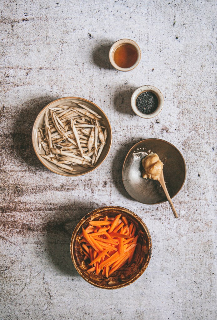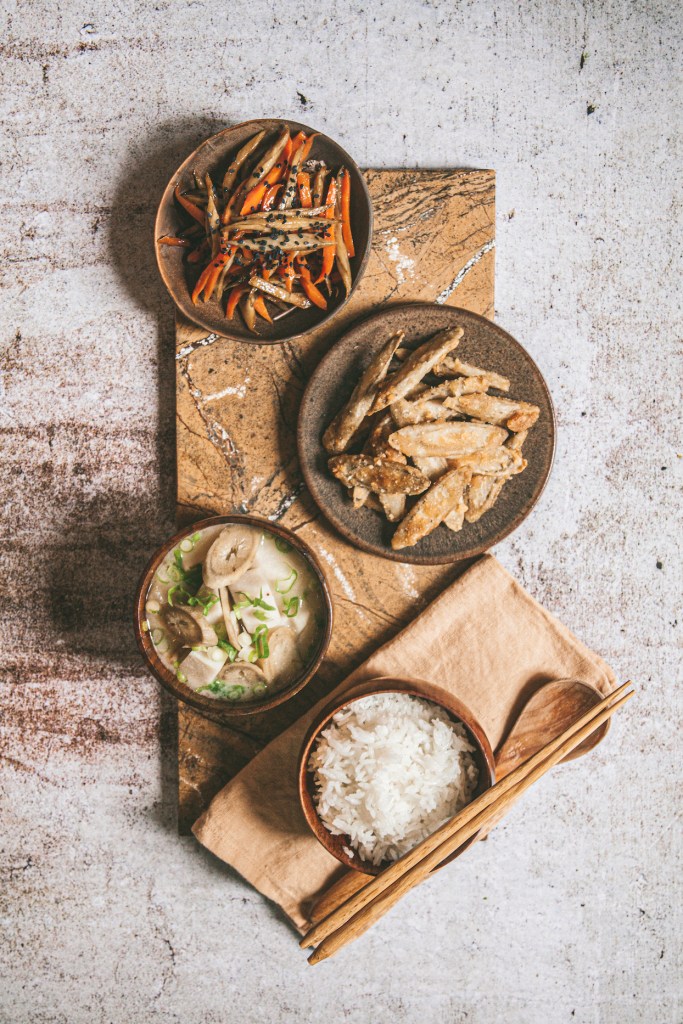 Ba món trong bữa ăn ngày mùa thu âm u xám xịt của nhà mình ngày hôm nay là củ ngưu bàng và cà rốt rim miso trắng, củ ngưu bàng tẩm bột chiên giòn và súp miso củ ngưu bàng khoai sọ ta daaa!!!