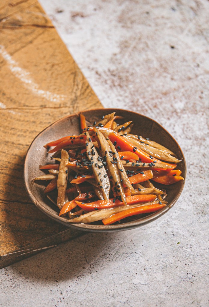 Món này có tên tiếng Nhật là kinpira gobo, với kinpira nghĩa là món rim và gobo có nghĩa là ngưu bàng. Đây là một món ăn có lẽ bạn nghe tên không thấy quen, nhưng chắc hẳn là bạn đã từng ăn ở đâu đó như một món ăn kèm trong bữa ăn Nhật hoặc là một phần trong hộp cơm bento kiểu Nhật rồi đó. Món rim này là một món ăn bình dân và đơn giản, có vị bùi bùi của các loại củ và vị ngọt nhẹ cũng như đậm đà của miso trắng .