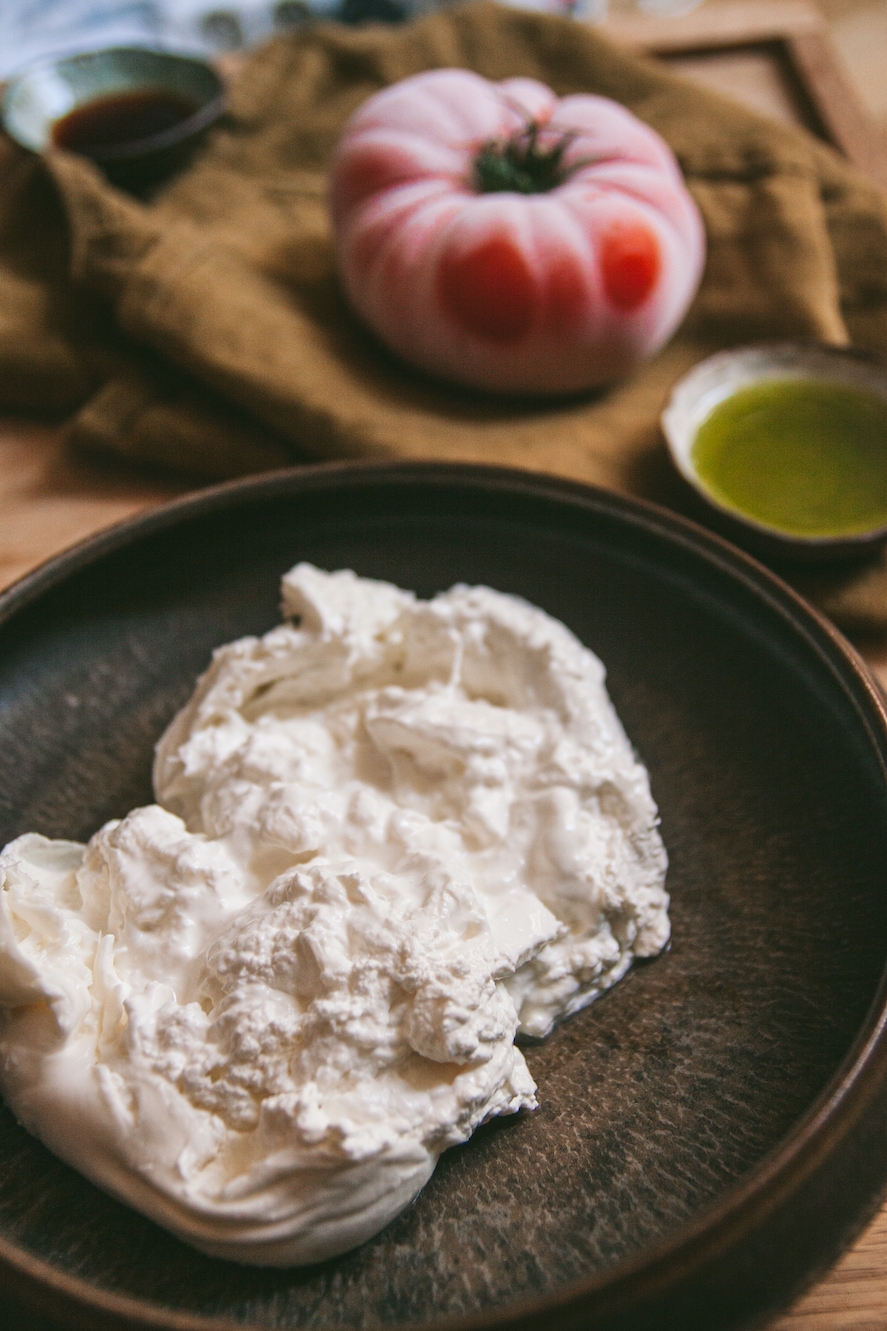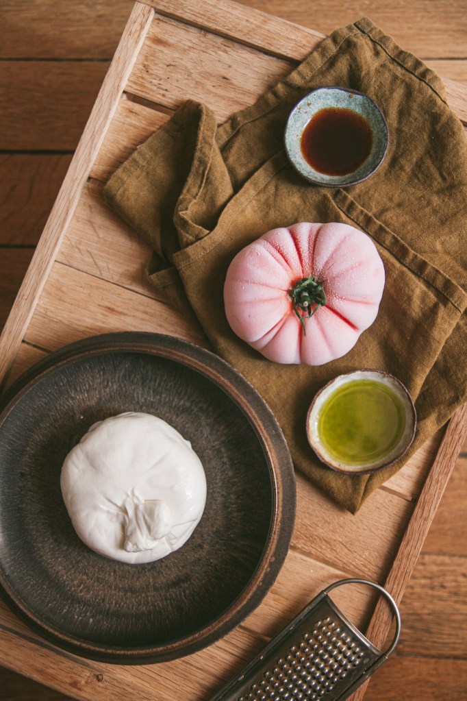 Vì món ăn chỉ gồm bốn nguyên liệu đơn giản, nên việc chọn nguyên liệu ngon sẽ quyết định thành phẩm món ăn. Burrata mình chọn mua loại mới thì lớp kem bên trong sẽ mềm ngậy hơn. Cà chua là nhân vật trung tâm thì đương nhiên sẽ cần chọn quả cà chua loại ngon, tươi mọng vừa chín tới, mùa hè là mùa nhiều nắng, mùa của cà chua nên sẽ không khó để tìm được một quả cà chua nhiều hương vị. Dấm mình dùng là dấm ngâm với vỏ quýt và quả của cây hoa hồng mà mình sẽ viết công thức sớm, nhưng có thể thay bằng một loại dấm dễ tìm hơn là dấm balsamic. Và thành phần cuối cùng – dầu ô liu, bạn nên chọn loại dầu ô liu ép lạnh để giữ trọn vẹn hương vị và chất dinh dưỡng có trong dầu. Mình dùng dầu ô liu có vị của lá húng tây basil mình tự làm nên có màu xanh lá (mình cũng sẽ hướng dẫn cách làm trong thời gian tới nhé!). Nếu không có sẵn loại dầu ô liu này thì bạn chỉ cần thêm vài lá húng tây basil lên trên món ăn, vừa để có đầy đủ hương vị, vừa để trang trí cũng rất ngon mắt!
