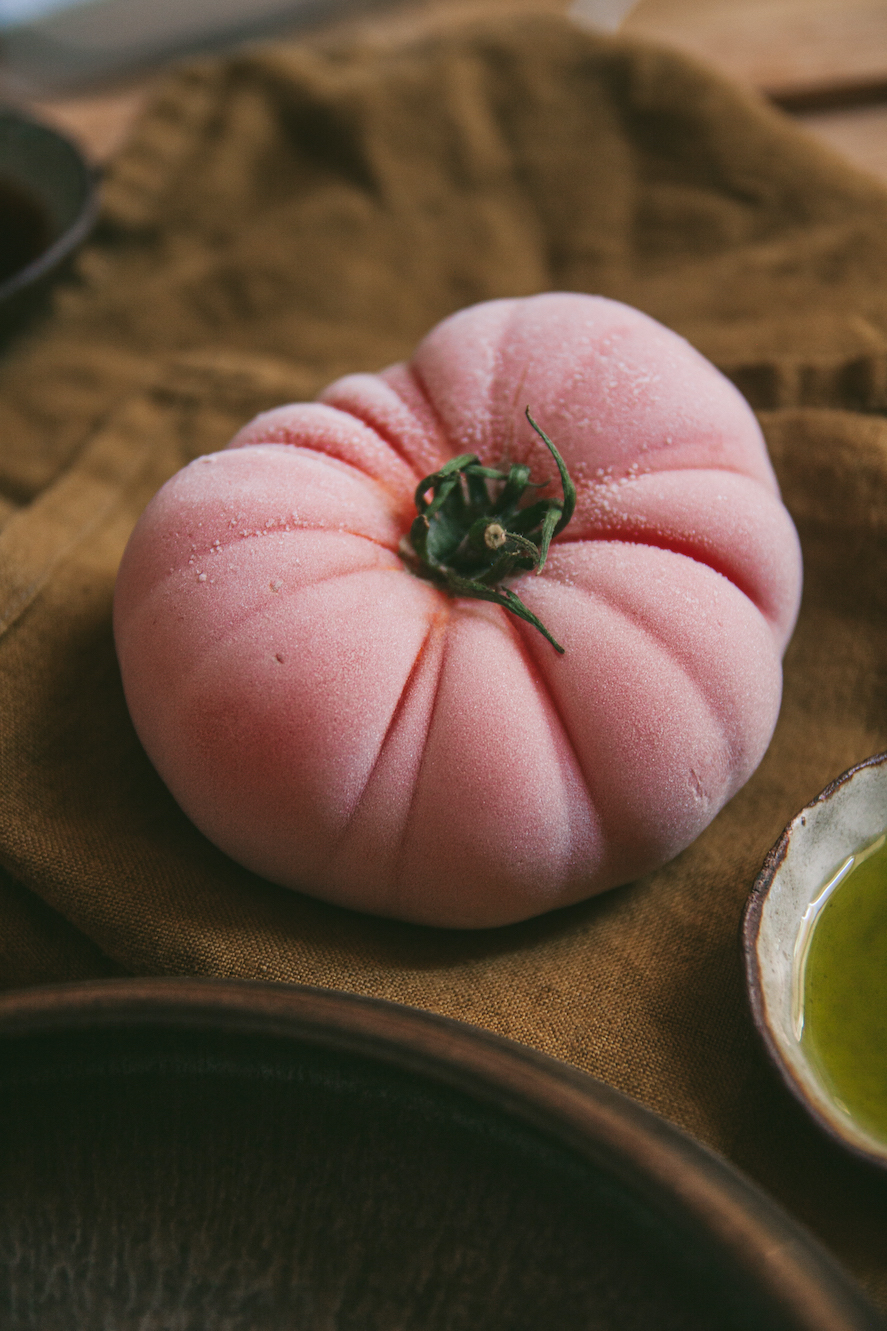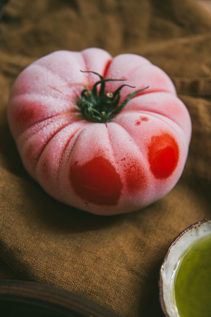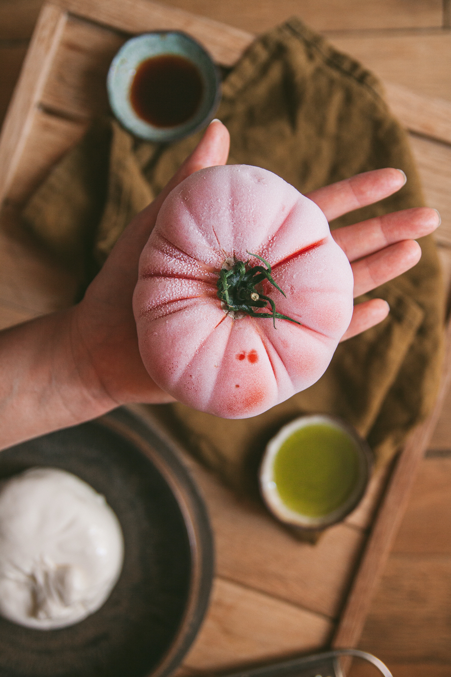 Như đã nói ở trên, mình rất mê quả cà chua. Không dưới một vài lần mình đã thấy rung động trước một chùm cà chua bị tươi mọng, một quả cà chua giống tim bò nhiều múi căng bóng, hay mải mê trước quầy hàng cà chua với vô vàn dáng hình, kích cỡ và màu sắc đa dạng đầy hấp dẫn. Và lần này khi lấy quả cà chua ra khỏi ngăn đá, nhìn một quả cà chua được phủ một lớp sương lạnh như tuyết ửng ửng hồng, đẹp hoàn hảo và kích thích vị giác vô cùng.