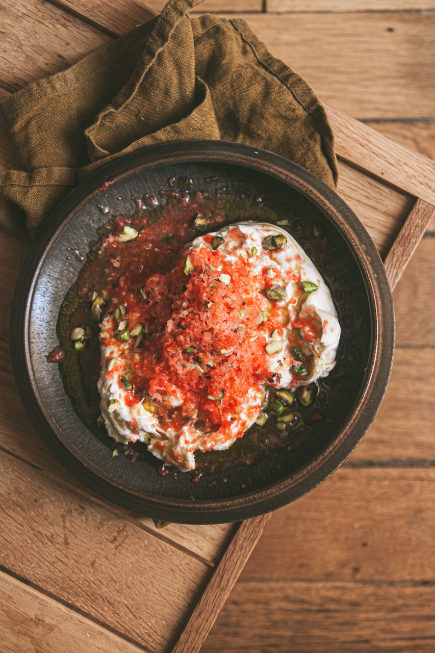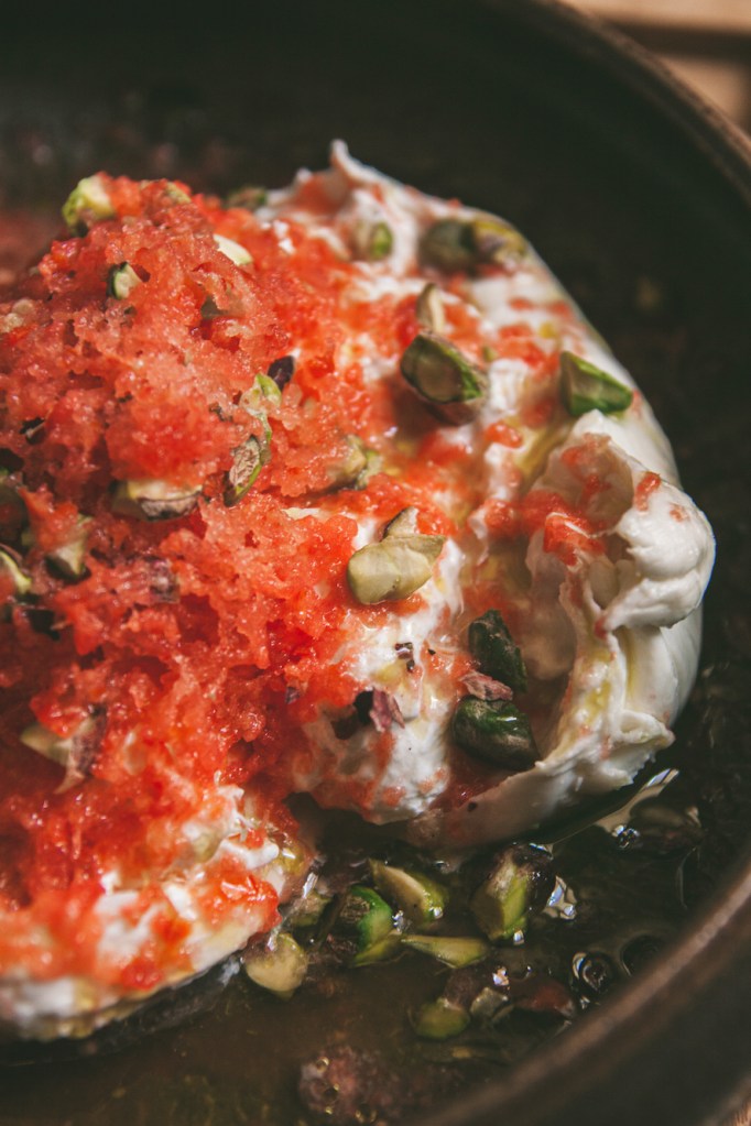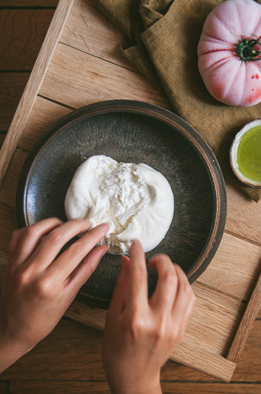 Thay vì mozzarella, loại phô mai mình dùng cho món này phô mai burrata – một loại phô mai có xuất xứ từ vùng Puglia ở miền Nam nước Ý. Về cơ bản, burrata gồm phần vỏ mozzarella dai và chắc bên ngoài, ôm lấy phần nhân kem mềm nhão bên trong. Nếu vốn đã yêu thích các loại phô mai mềm ngậy như mozzarella, thì hẳn bạn cũng sẽ như mình, mê burrata ngay từ khi nhìn thấy viên phô mai tròn căng, trắng nõn núng nính, chứ chưa nói đến khi nhẹ nhàng xé lớp vỏ bên ngoài ra, để lộ lớp kem tươi và straciatella mướt mềm sóng sánh bên trong.
