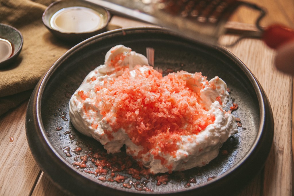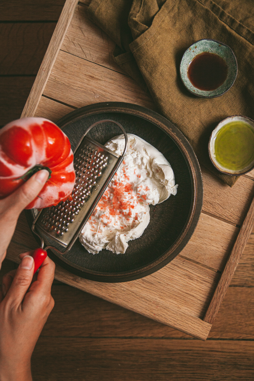 - Dùng dụng cụ bào nhỏ để bào quả cà chua đông lạnh lên trên phần phô mai. Phần này cần thao tác nhanh, thứ nhất là vì các ngón tay sẽ nhanh lạnh cóng lại vì cầm quả cà chua, thứ hai là khi đã bào nhỏ ra, cà chua sẽ rất nhanh tan và mất độ tươi mát tê đầu lưỡi của món ăn.