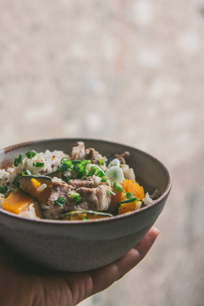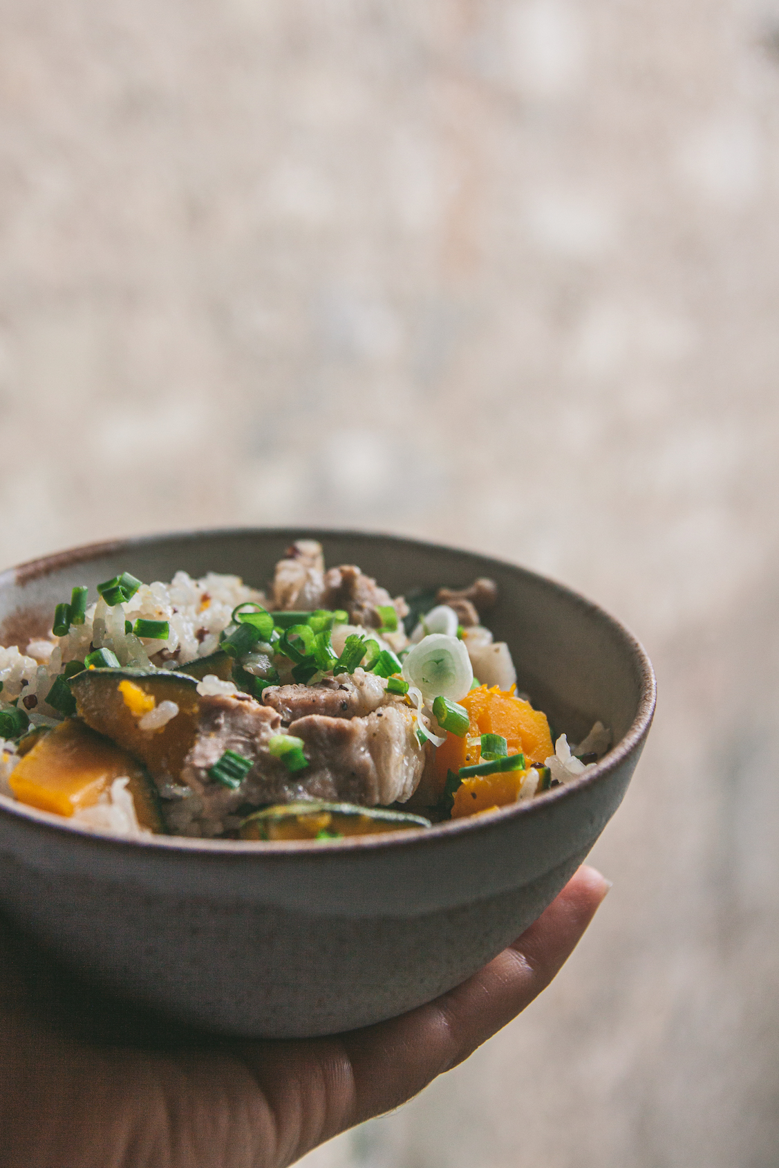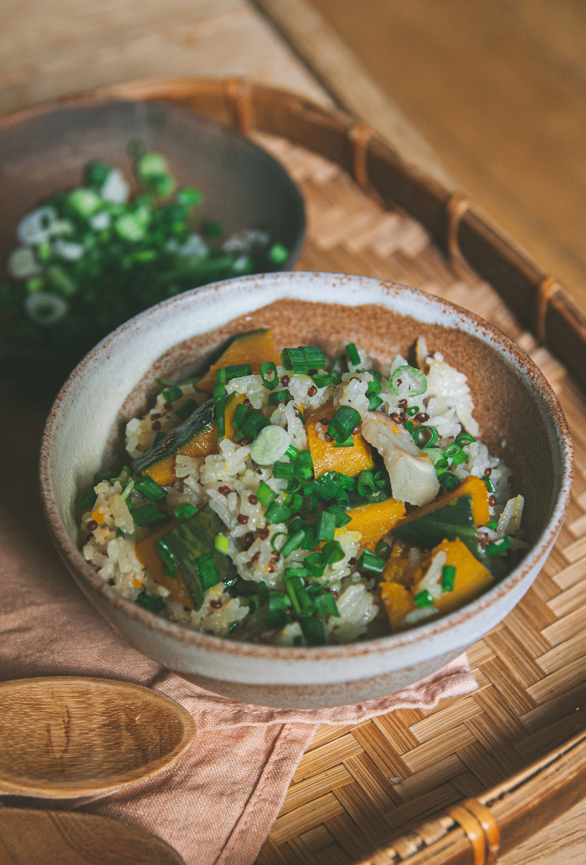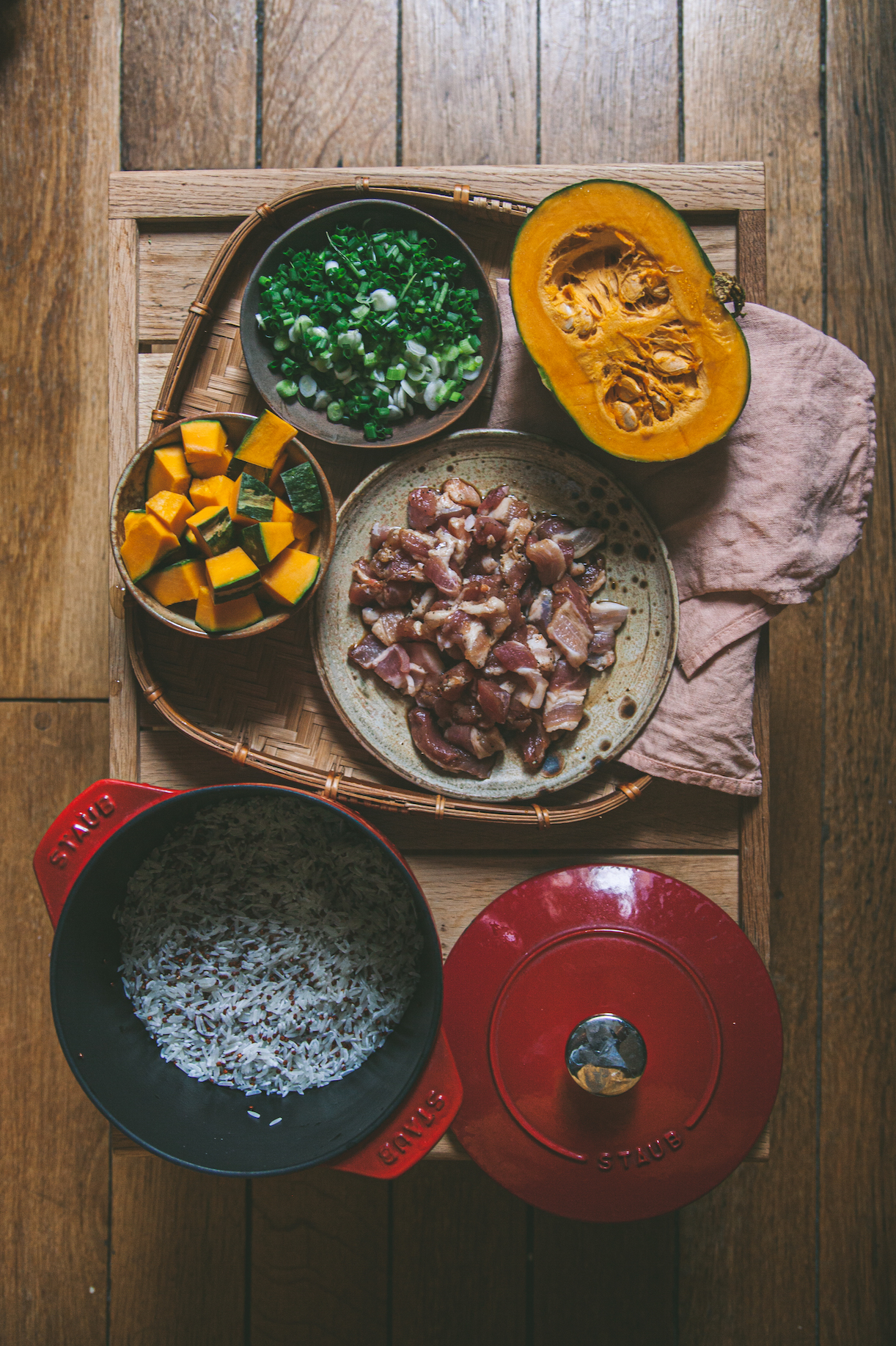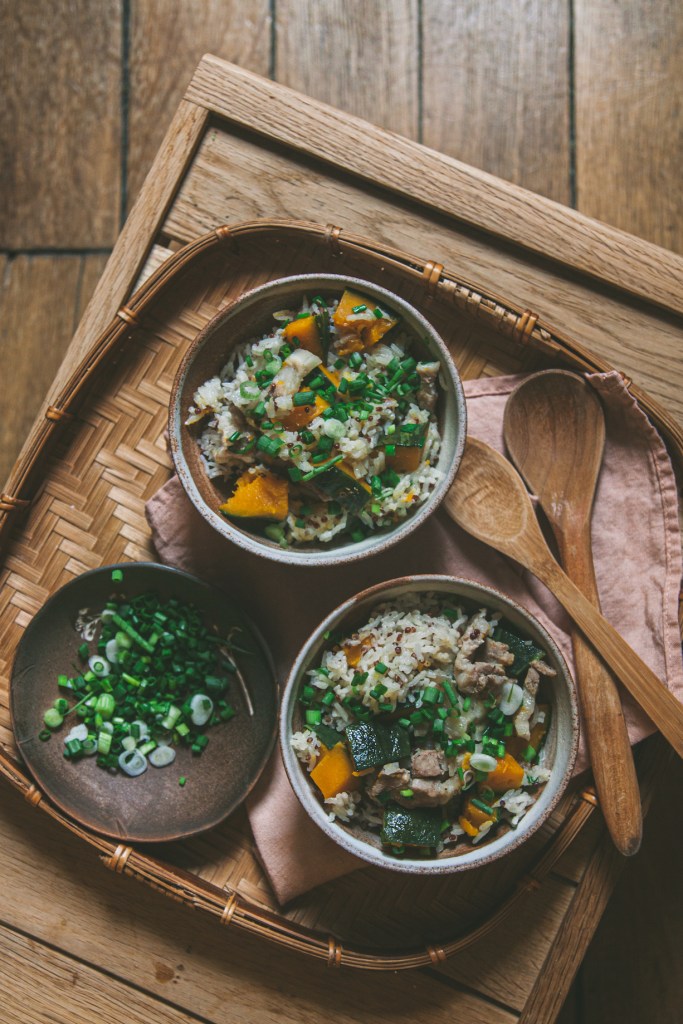Ngoài cách làm đơn giản thì nguyên liệu của món này cũng không hề cầu kỳ: gạo ngon, bí đỏ, thịt heo ba chỉ (bạn có thể thay thế bằng thịt heo xay/băm), hành lá và nước dùng. Trong món này thì mình dùng nước dùng dashi để vị ngọt của nấm và rong biển kombu trong nước dùng ngấm vào bí và thịt, sẽ làm món ăn đậm đà hơn, nhưng nếu chưa kịp chuẩn bị thì bạn dùng nước lọc như nấu cơm bình thường là được. Phần hay ho của công thức này là mình có thêm vào một lưng bát hạt quinoa đỏ. Loại quinoa đỏ này có phần vỏ cứng và lâu chín hơn, nên khi nấu cùng với cơm thì lúc cơm chín là lúc hạt quinoa cũng vừa đủ độ chín tới, bên trong hạt đã dẻo nhưng phần vỏ bên ngoài vẫn còn nguyên, tạo cảm giác lép bép sần sật khi ăn mình khá thích. Nếu bạn chỉ thích ăn cơm trắng thì có thể bỏ qua nguyên liệu này, hoặc thay thế bằng một loại hạt khác như quinoa trắng, ngô, hạt kê…
