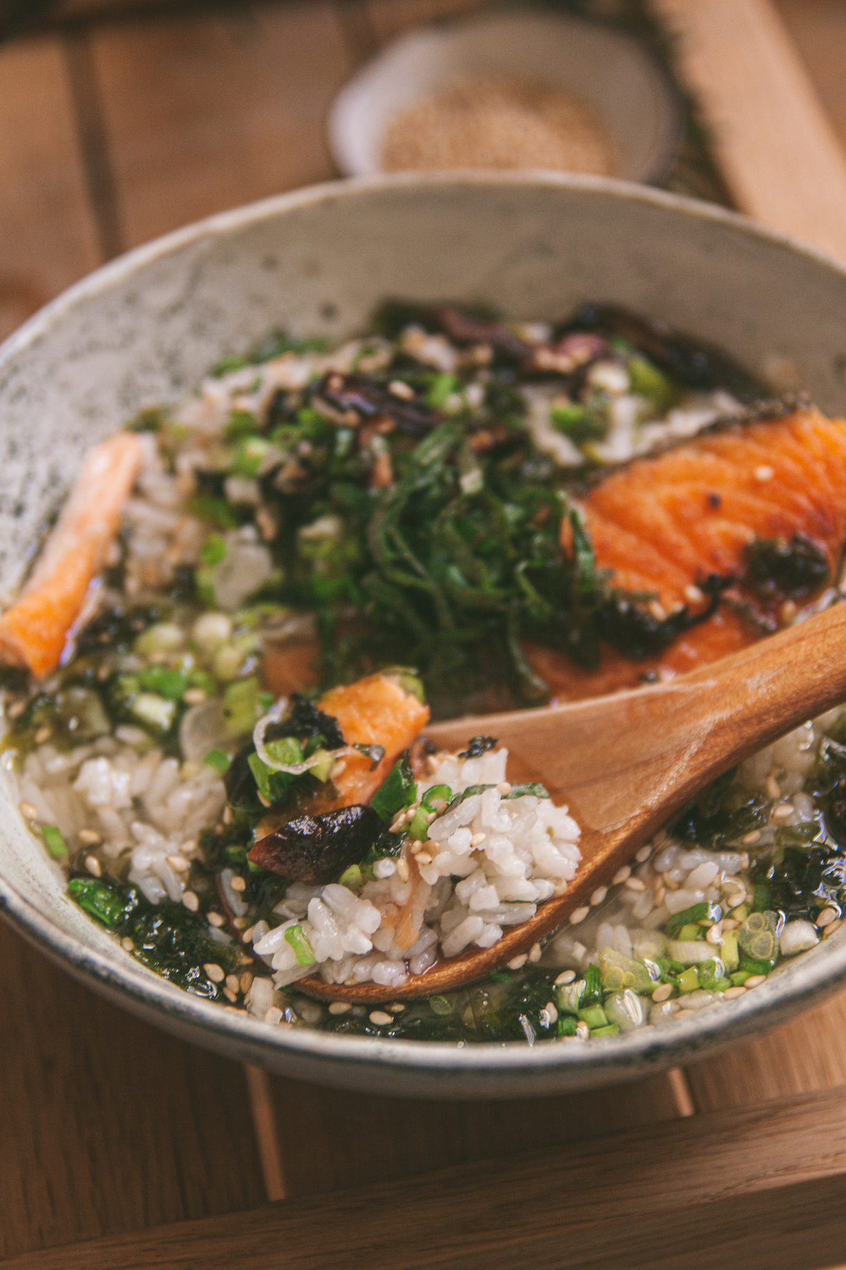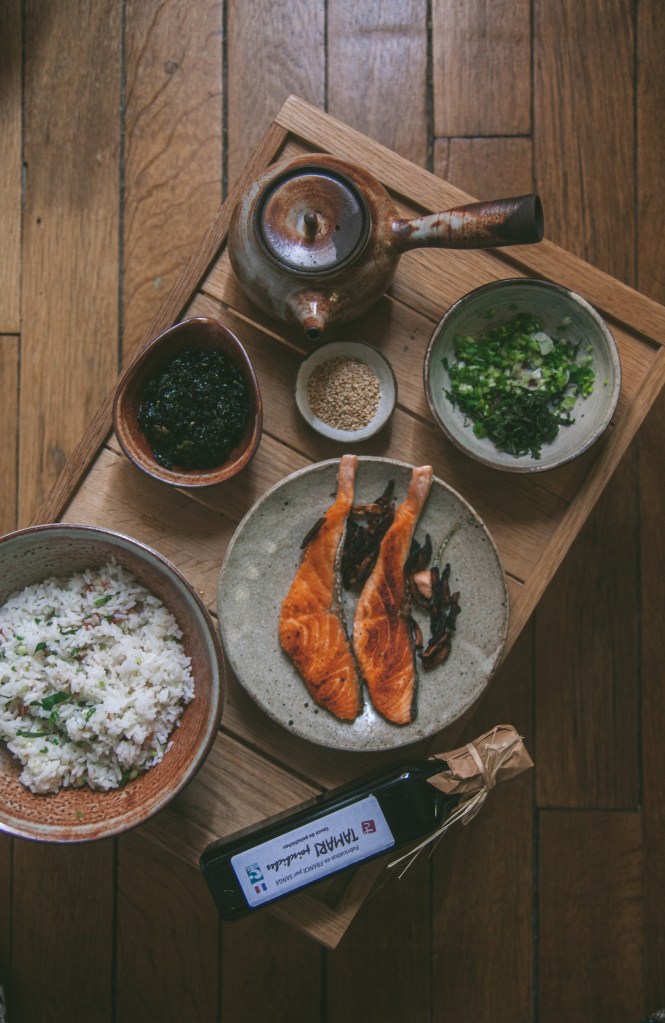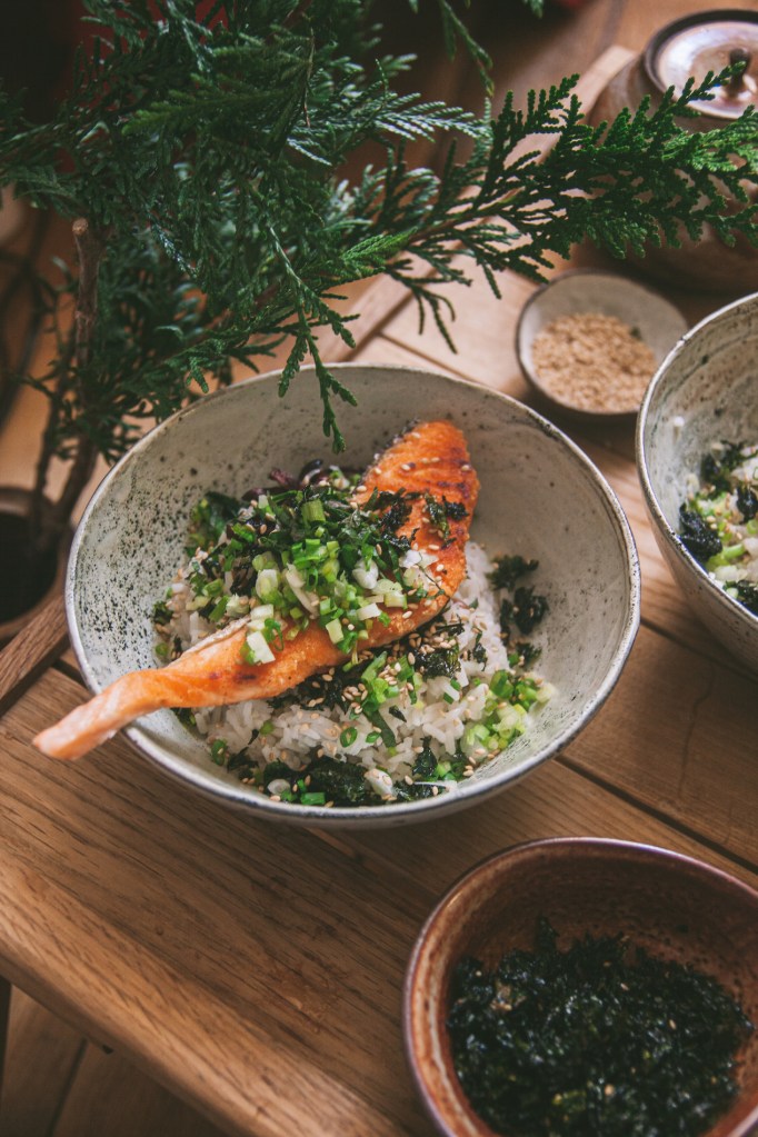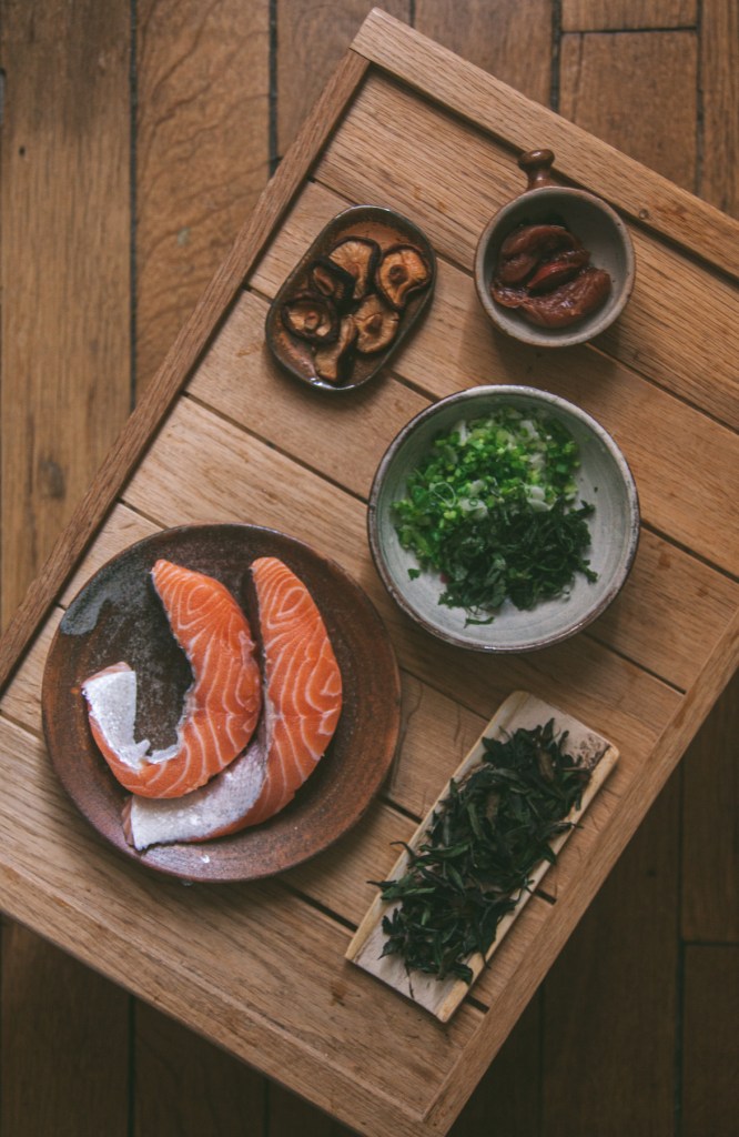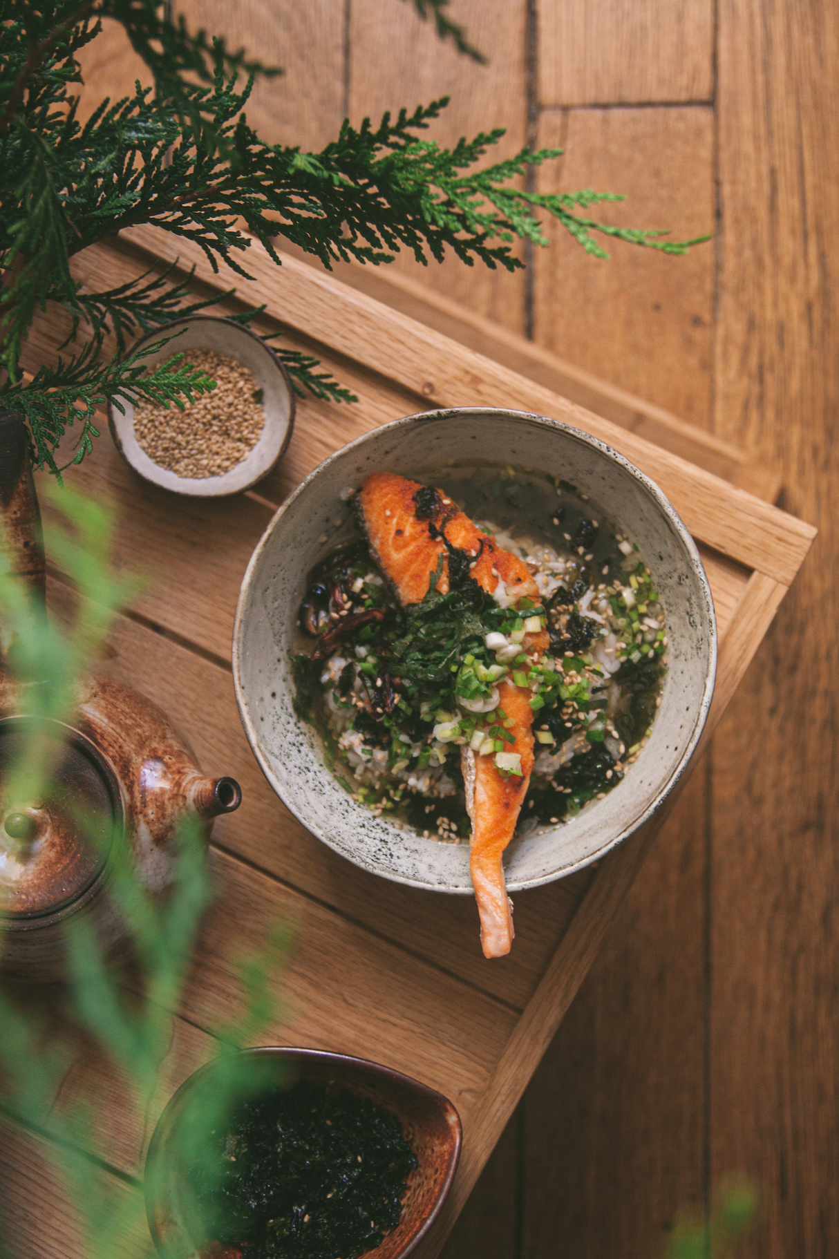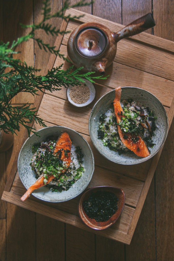 Món ăn nhà mình hôm nay sẽ là món ochazuke kết hợp các nguyên liệu nhà đang có sẵn với cá hồi chiên, mơ muối, rong biển và nấm shitake khô. Món ăn mang hương vị hài hòa giữa béo, chua, mặn, và thanh của nước trà.