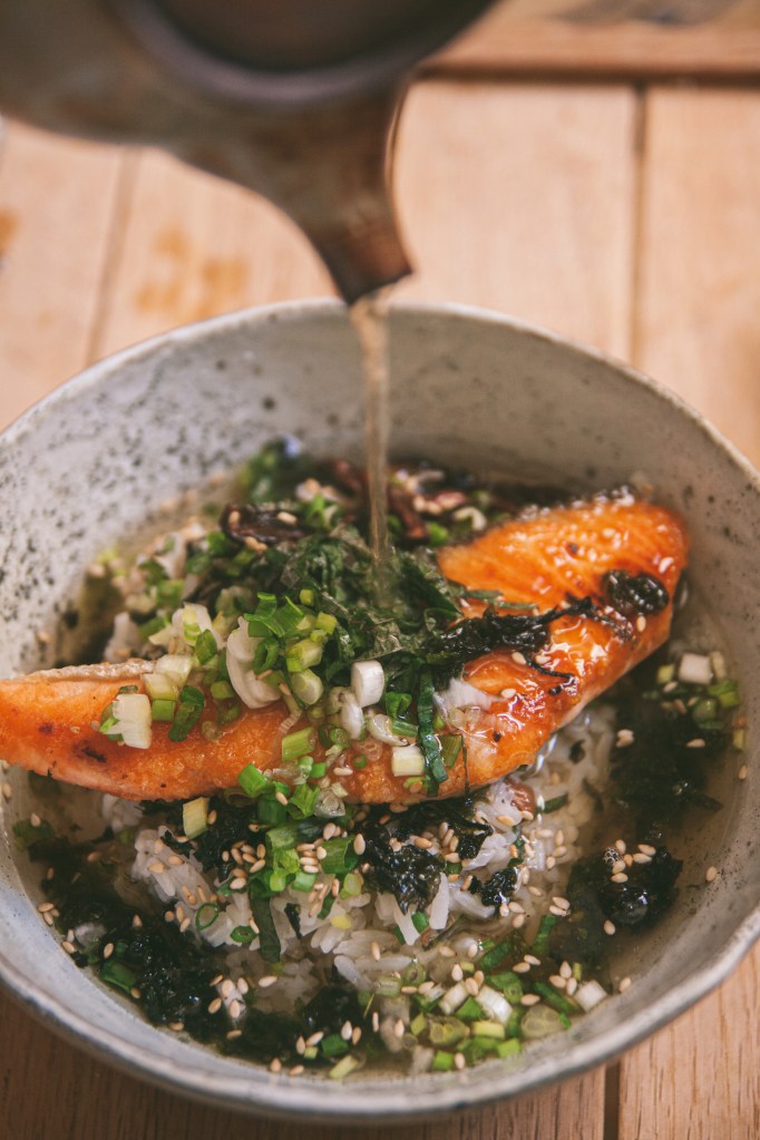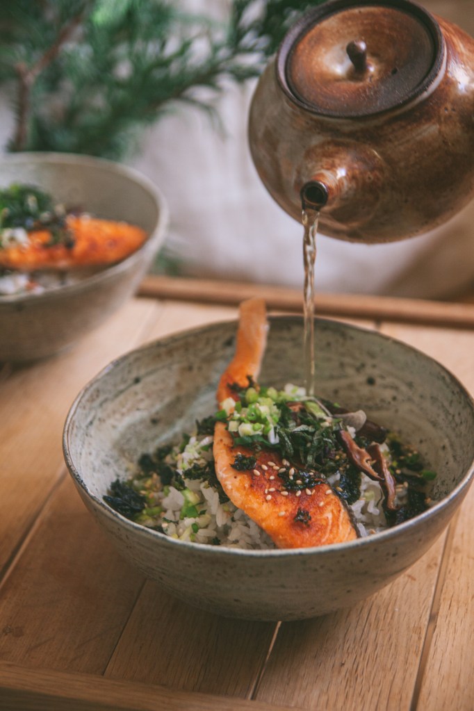 Ngay khi chan trà nóng vào bát, một làn hương dịu dàng bốc lên mang mùi trà thoảng nhẹ hương hoa, mùi cá hồi chiên thơm lừng, hoà quyện với vị mơ muối chua mặn hài hoà và chút ngọt đất của nấm hương.