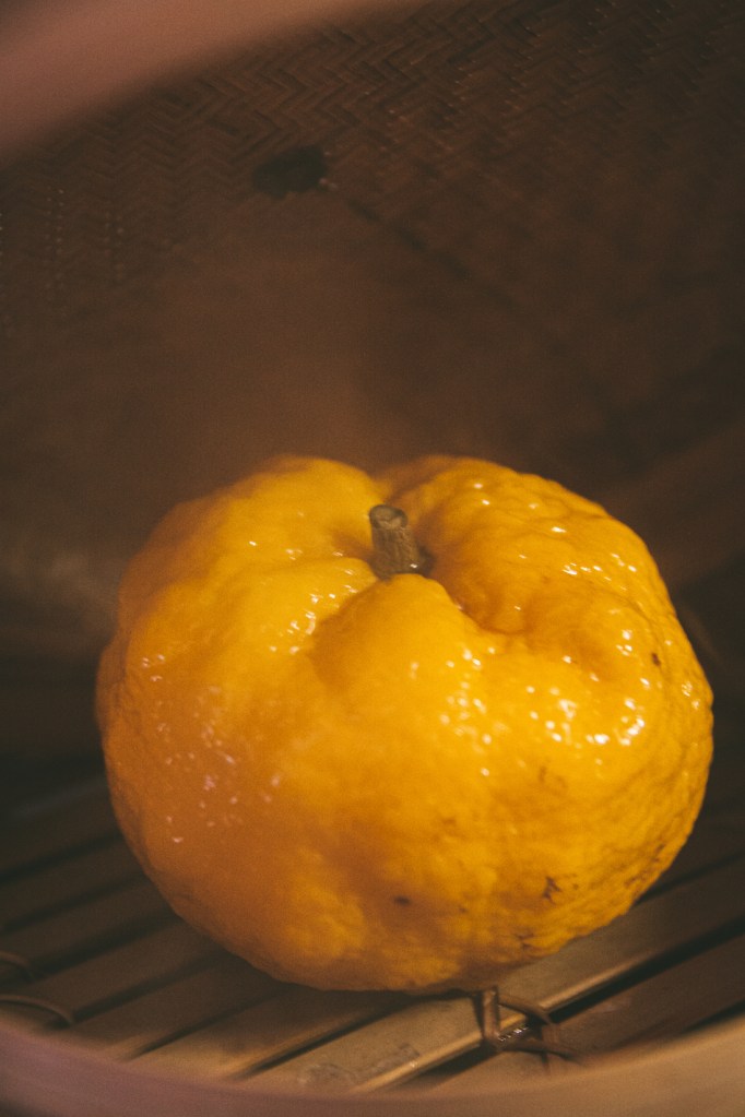 - Yuzu rửa sạch, cho vào hấp chín đến khi mềm và dậy mùi thơm.